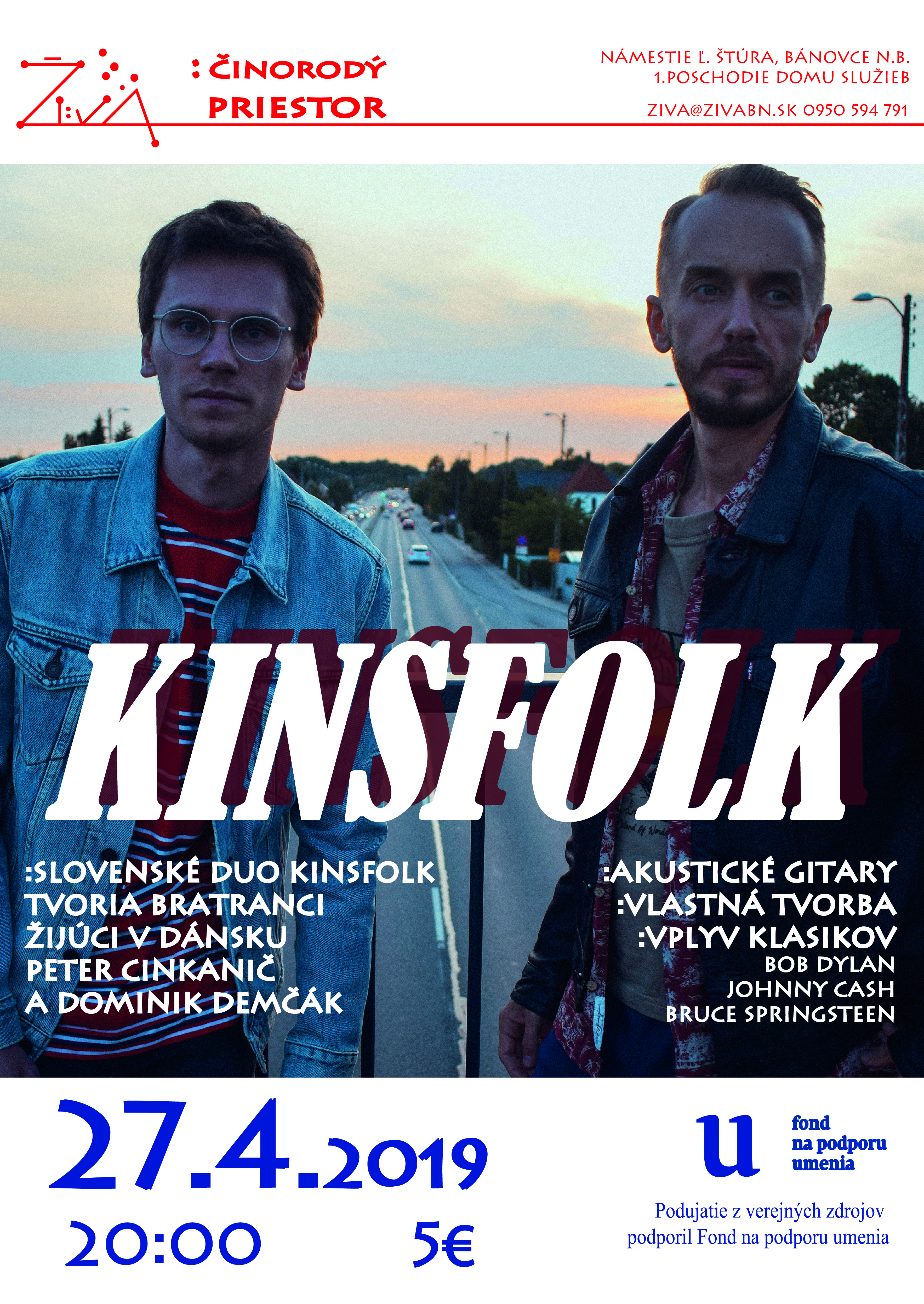 Slovenské duo Kinsfolk, ktoré tvoria bratranci žijúci v Dánsku Peter Cinkanič a Dominik Demčák, sa pred piatimi rokmi predstavili verejnosti svojím prvým videoklipom Adelaide: https://www.youtube.com/watch?v=cROnnkmnXUs (--púšťaj na plné--) Za sebou majú klubové i festivalové vystúpenia (2017-Sziget) a v zásobe zaujímavý koncertný repertoár. Akustické gitary, vplyv klasikov ::Bob Dylan, Johnny Cash, Bruce Springsteen ... ::, vlastná tvorba, príjemný spev --- to všetko v apríli v Ži:va