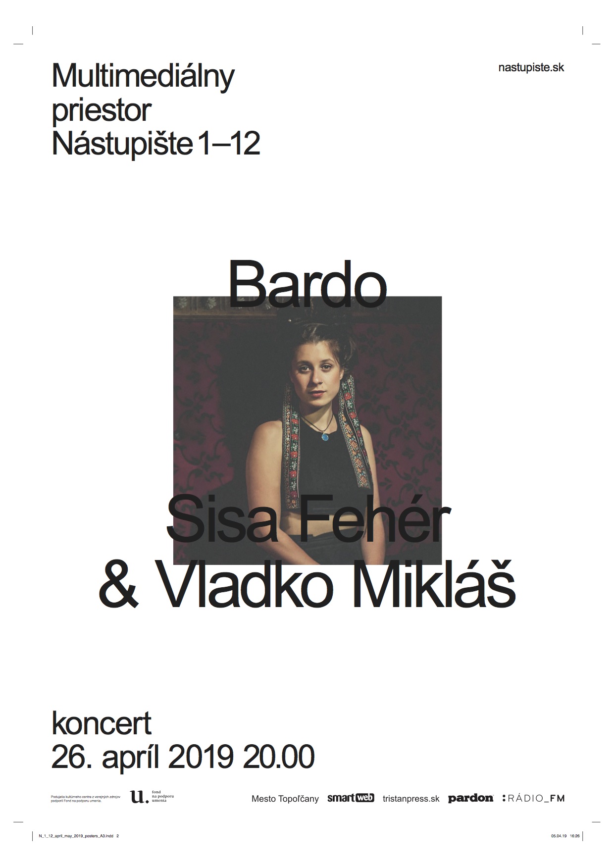 Bardo: Sisa Fehér & Vladko Mikláš / Topoľčany Bardo je nový album speváčky a skladateľky Sisy Fehér v spolupráci s multiinštrumentalistom Vladkom Miklášom. Lyrika skrz vrstvené spevy & gitary za doprovodu bicích, kontrabasu a syntetizátorov ponúka celkom nový magický hudobný svet. Piatok 26. apríla 2019 o 20:00 Sisa Feher - spev Vladko Mikláš - gitara, spev Dan Hasalík - gitara, synth Rasťo Uhrík - kontrabas, basgitara, synth Petr Nohavica - bicie