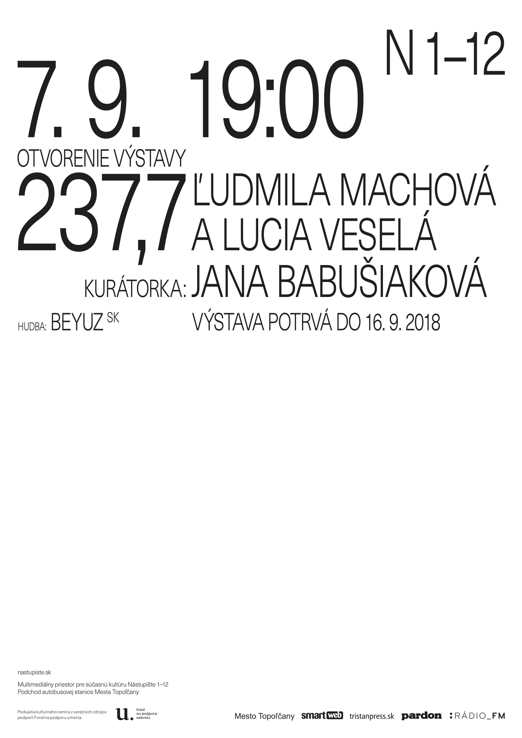 Multimediálny priestor pre súčasnú kultúru Nástupište 1-12 podchod autobusovej stanice v Topoľčanoch pozýva na otvorenie výstavy s názvom 237,7 Ľudmila Machová, Lucia Veselá Kurátorka: Jana Babušiaková Koncert : Juraj Beyuz/ SK www.beyuz.com 7.9.2018 o 19h / otvorenie výstavy