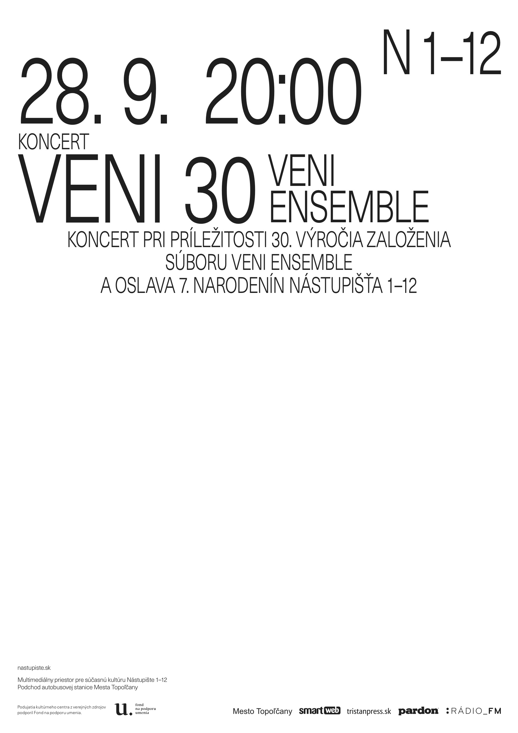Multimediálny priestor pre súčasnú kultúru Nástupište 1-12 podchod autobusovej stanice v Topoľčanoch pozýva na koncert VENI 30 Dňa 28.9.2018 o 19h Oslávme 7.narodeniny činnosti Nástupišťa 1-12 pri príležitosti 30. výročia súboru VENI ensemble na scéne, pod vedením Daniela Mateja.