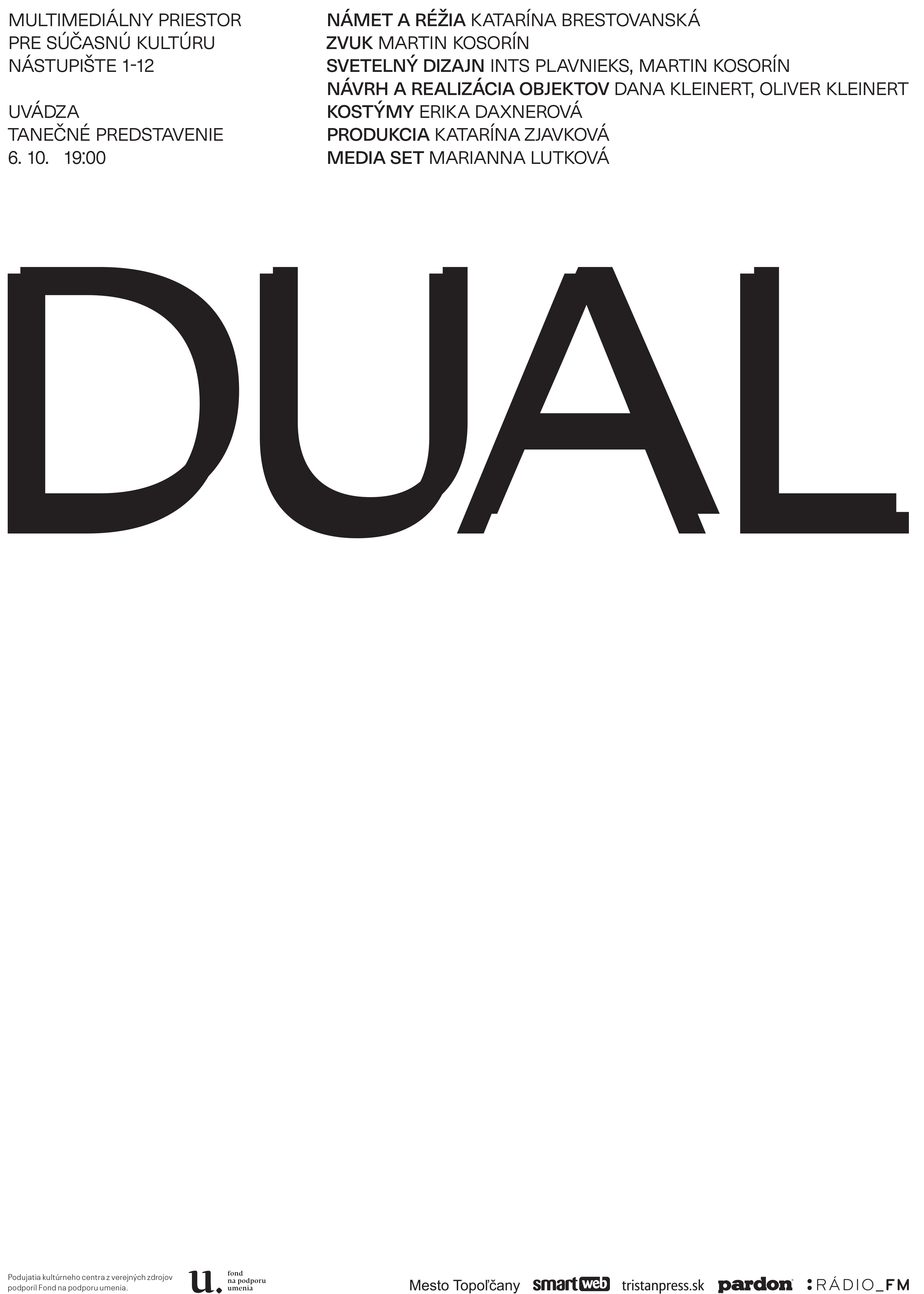 Multimediálny priestor pre súčasnú kultúru Nástupište 1-12 podchod autobusovej stanice v Topoľčanoch pozýva v sobotu, 6.októbra o 19h na tanečné predstaveni DUAL Réžia: Katarina Brestovanska Dĺžka: 60 minút Hrajú: Edita Antalová, tanec Lukáš Bobalík, tanec Réžia: Katarína Brestovanská Choreografia:Katarína Brestovanská Zvuk: Martin Kosorín Svetlá: Martin Kosorín, LIGHTDESIGN, nts Plavnieks Kostýmy: Erika Daxnerová Stavba scény: Dana Kleinert, Oliver Kleinert Produkcia: Ka