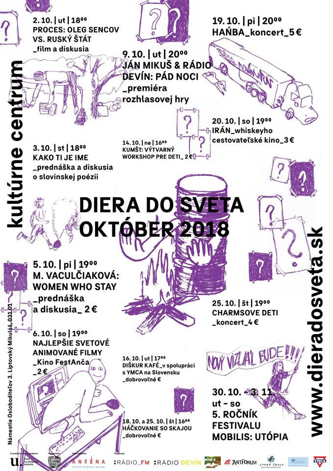 Sme tu a v mesiaci september 2018 to sú už 4 roky. Nestihli sme urobiť oslavu, ale nesmútime, odkladáme šampanské do 5 roku! Kultúrne centrum Diera do sveta aj tento mesiac pripravilo bohatý program, mrknite na to!