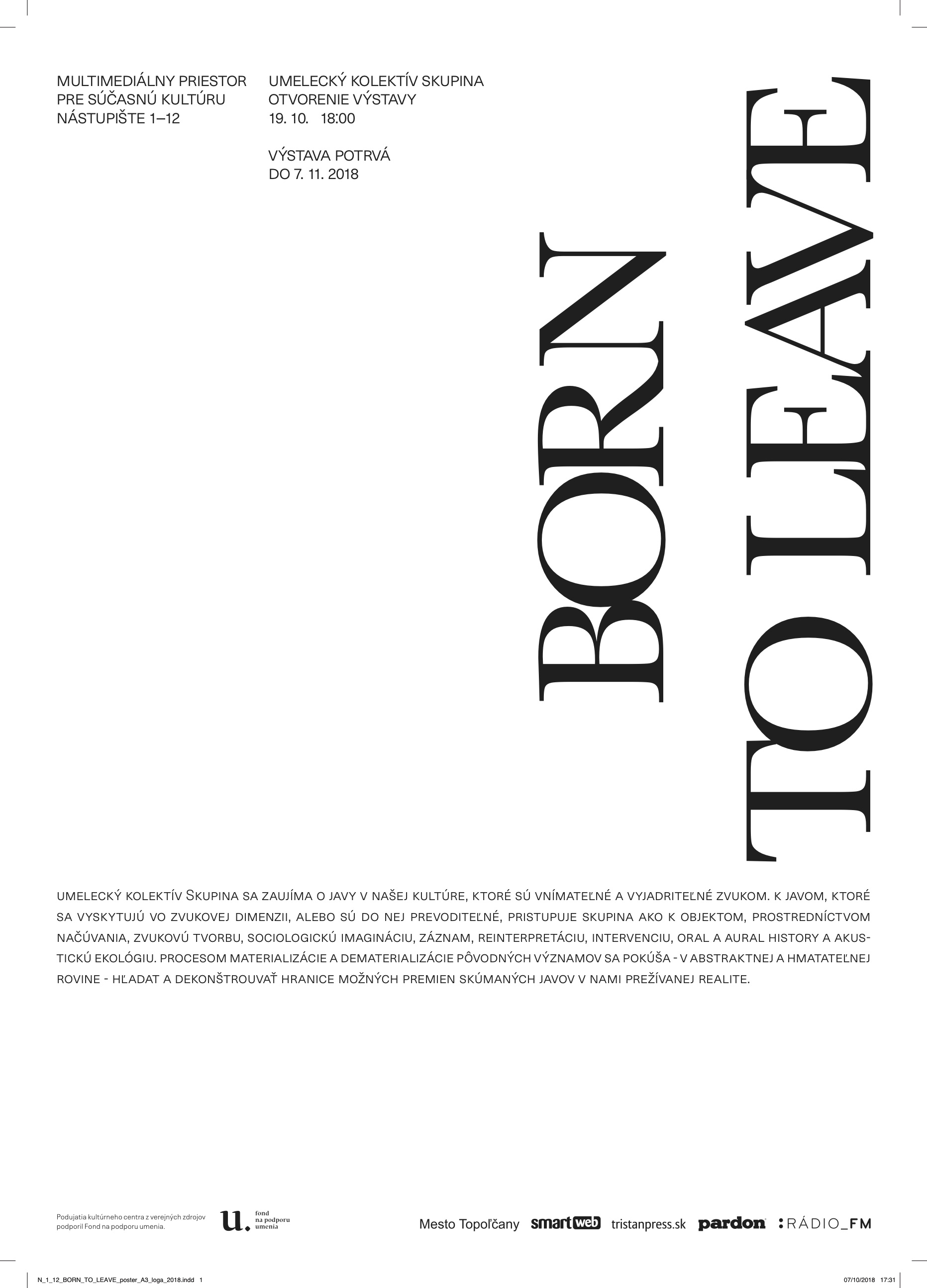 Multimediálny priestor pre súčasnú kultúru Nástupište 1-12 podchod autobusovej stanice v Topoľčanoch pozýva na otvorenie výstavy BORN TO LEAVE site specific zvuková inštalácia autori : Umlecký kolektív SKUPINA otvorenie výstavy: 19.10.2018 o 18h výstava potrvá do 7.11.2018 výstava vznikla ako výstup z rezidencie na Nástupišti v Topoľčanoch