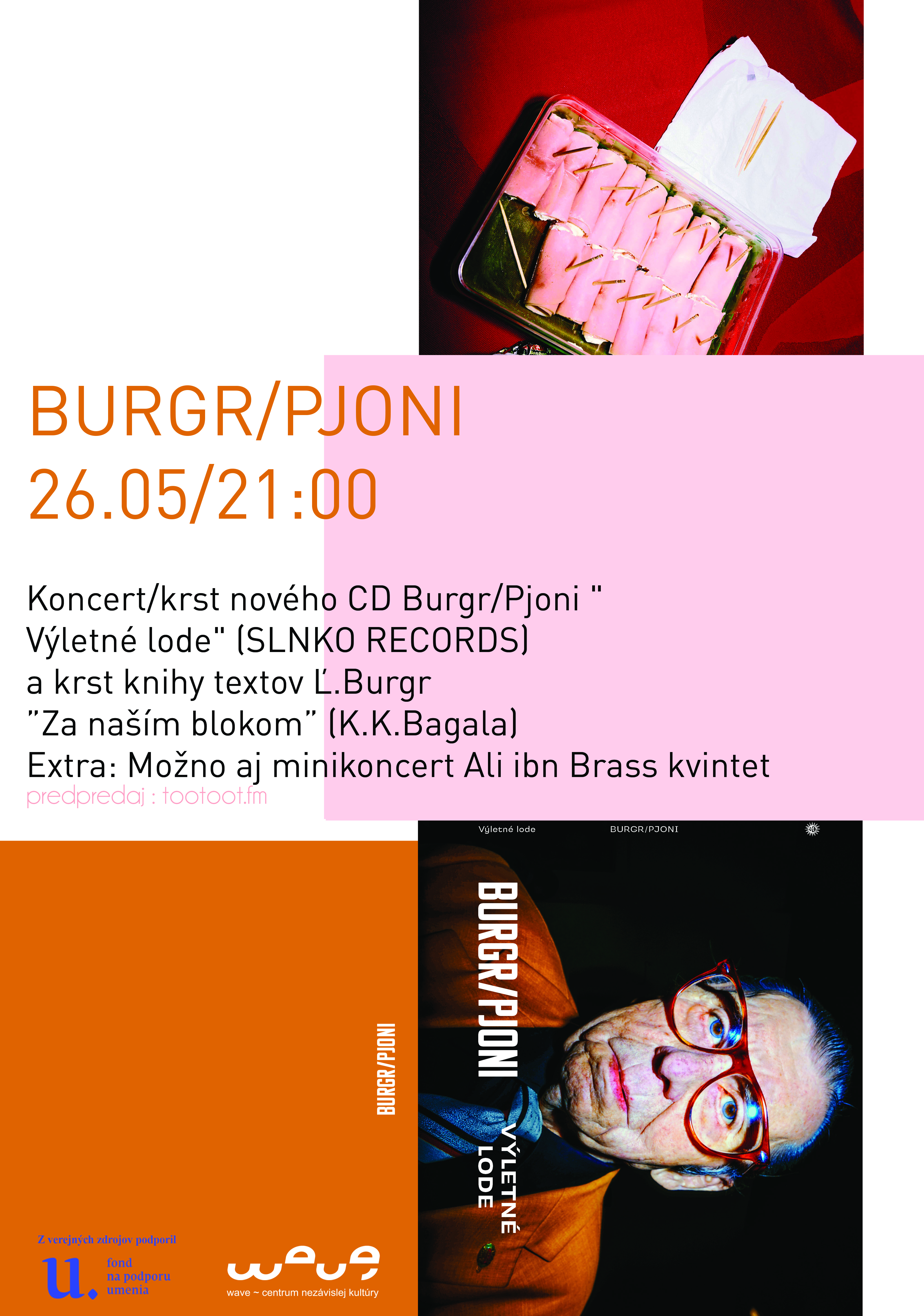 Koncert/krst nového CD Burgr/Pjoni "Výletné lode" (SLNKO RECORDS) a krst knihy textov Ľ.Burgr ”Za naším blokom” (K.K.Bagala) Extra: Možno aj minikoncert Ali ibn Brass kvintet Z verejných zdrojov podporil Fond na podporu umenia