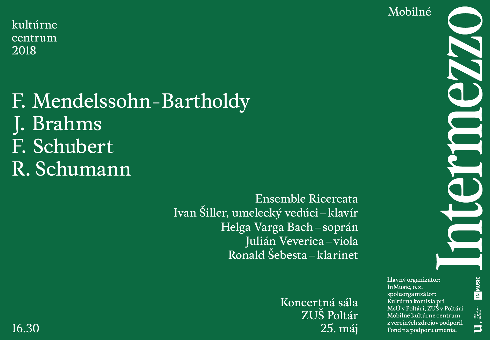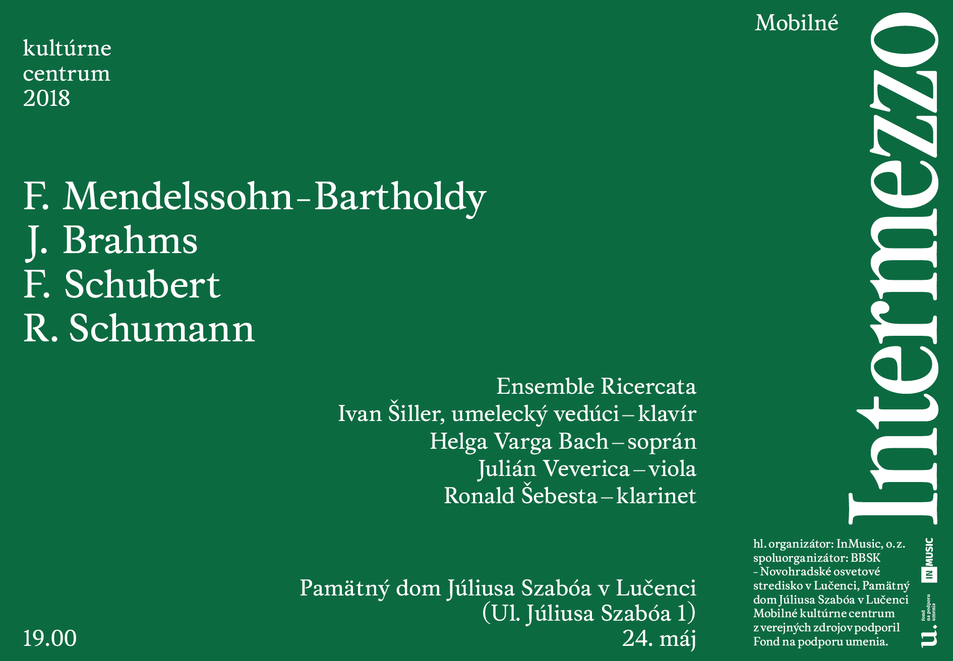 Devätnáste storočie bolo intermezzom – prechodom medzi „starým“ a „novým“ svetom. V tomto "intermezze" vznikli diela, ktoré odznejú na koncerte komornej hudby. Skladby pre soprán, violu, klarinet a klavír, ktoré sa nesú v romantickom duchu, potešia každého - znalca klasickej hudby, ale aj toho, ktorý ku klasickej hudbe práve len "pričuchne". Mobilné kultúrne centrum prináša komornú hudbu tentokrát do Lučenca.