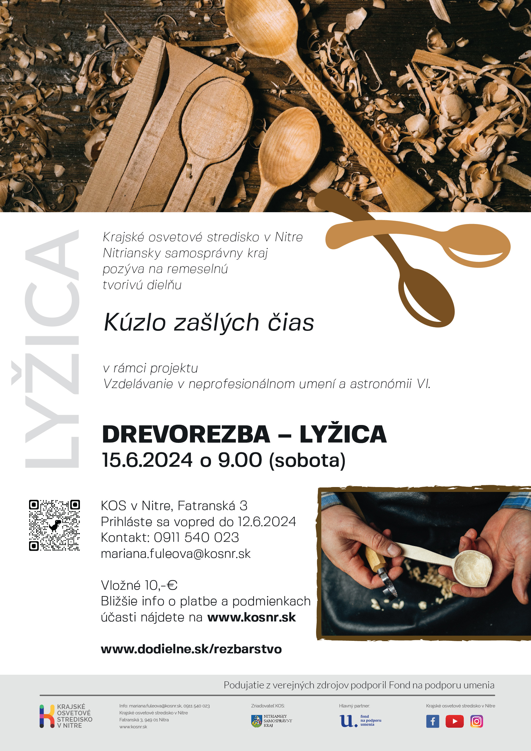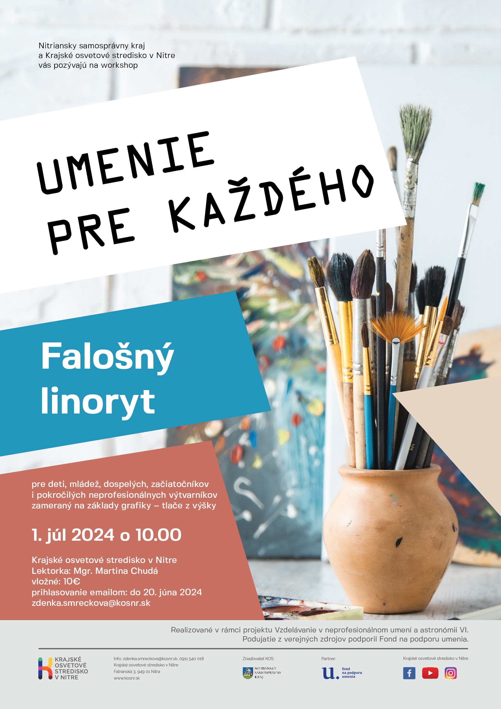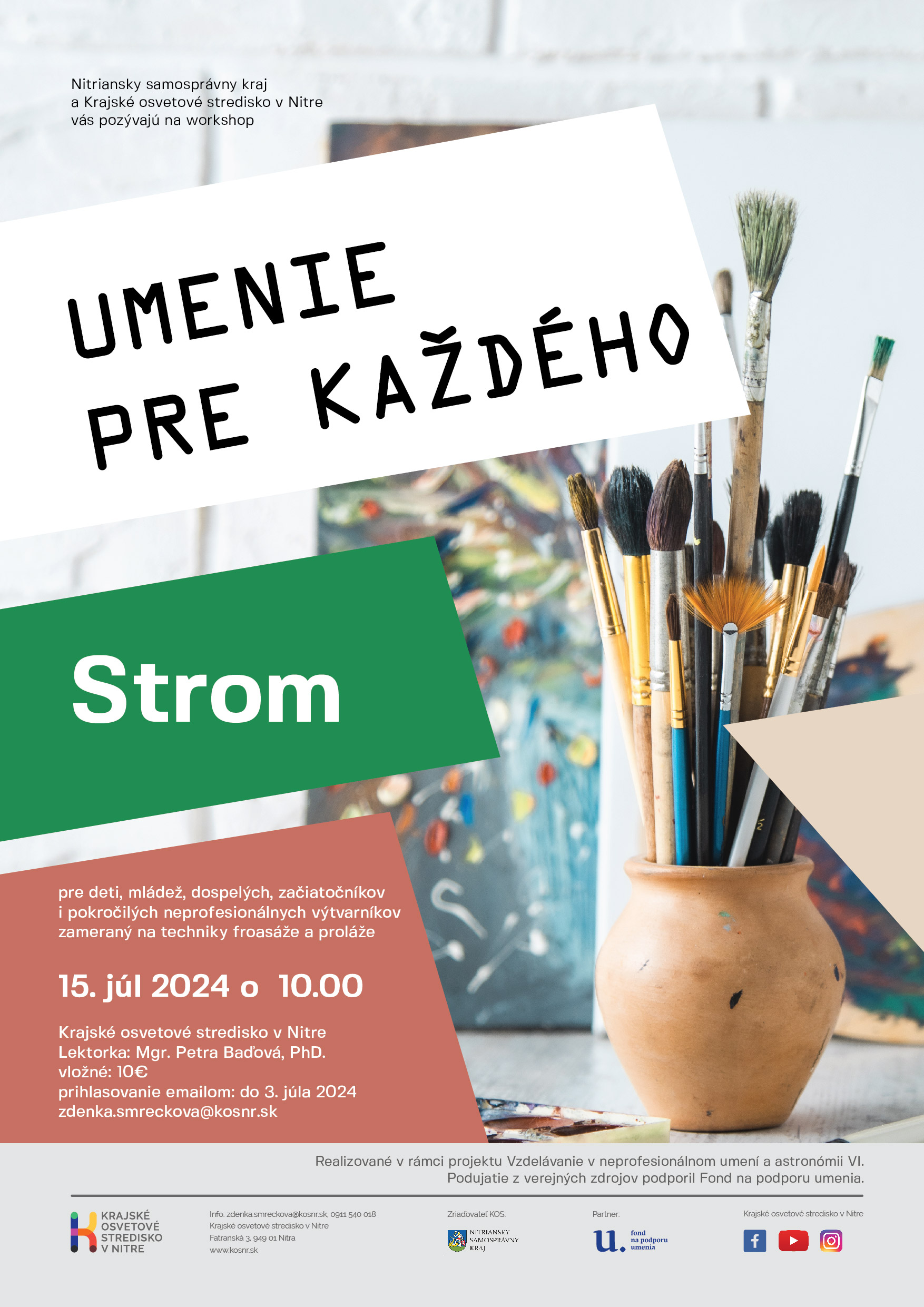 15. 7. 2024 UMENIE PRE KAŽDÉHO – STROM výtvarný workshop pre deti, mládež, dospelých, začiatočníkov i pokročilých neprofesionálnych výtvarníkov zameraný na techniky froasáže a proláže lektorka: Mgr. Petra Baďová, PhD. kde: Krajské osvetové stredisko v Nitre