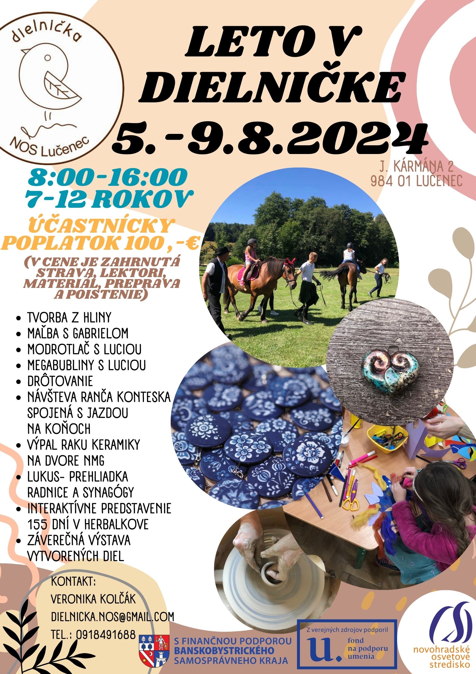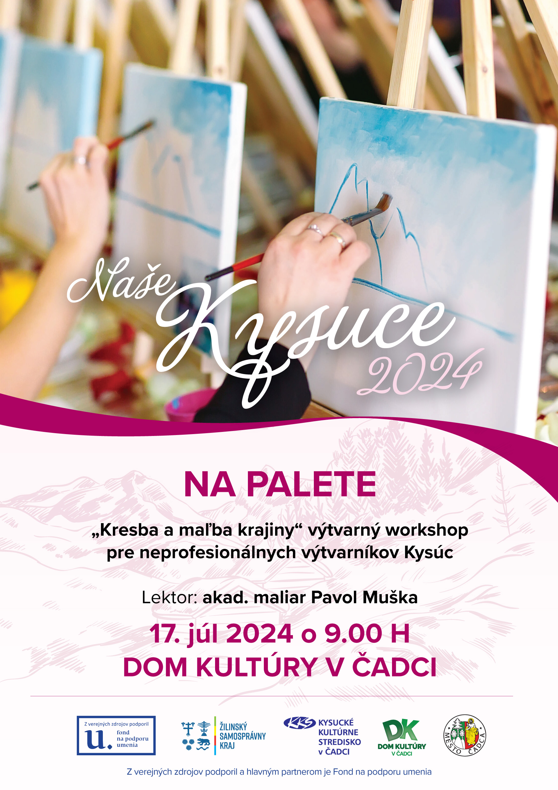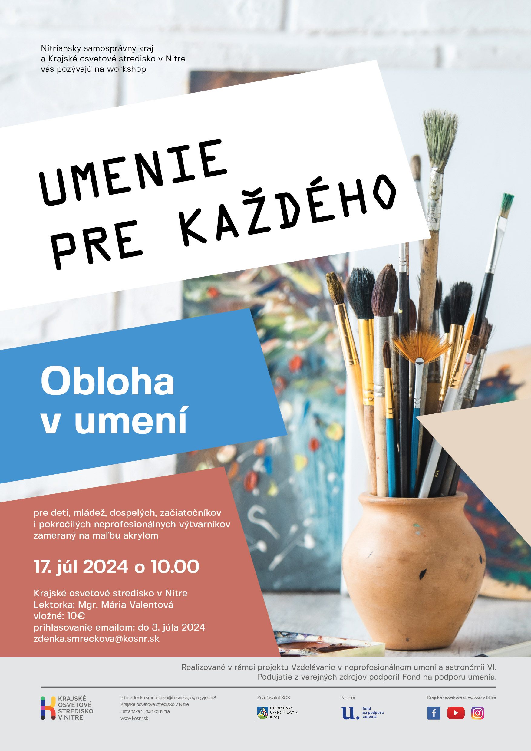 17. 7. 2024 UMENIE PRE KAŽDÉHO – OBLOHA V UMENÍ výtvarný workshop pre deti, mládež, dospelých, začiatočníkov i pokročilých neprofesionálnych výtvarníkov zameraný na maľbu akrylom lektorka: Mgr. Mária Valentová kde: Krajské osvetové stredisko v Nitre