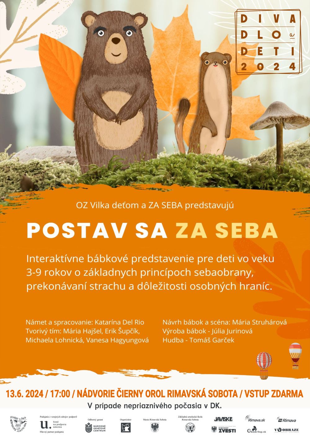 Pre všetky deti a ich rodičov sme vo štvrtok, 13. 6. 2024 o 17.00 hod. na nádvorí Čierny orol pripravili skvelý divadelný zážitok v podobe predstavenia POSTAV SA ZA SEBA. Jedinečný príbeh lesných zvierat a tvorov nám odhalí, aké dôležité je postaviť sa za seba a za všetkých, ktorí to potrebujú. Dokonca aj vtedy, keď si myslíte, že to nedokážete. Predstavenie je hosťom festivalu Divadlo a deti 2024, ktoré z verejných zdrojov podporil Fond na podporu umenia. Vstup zdarma.