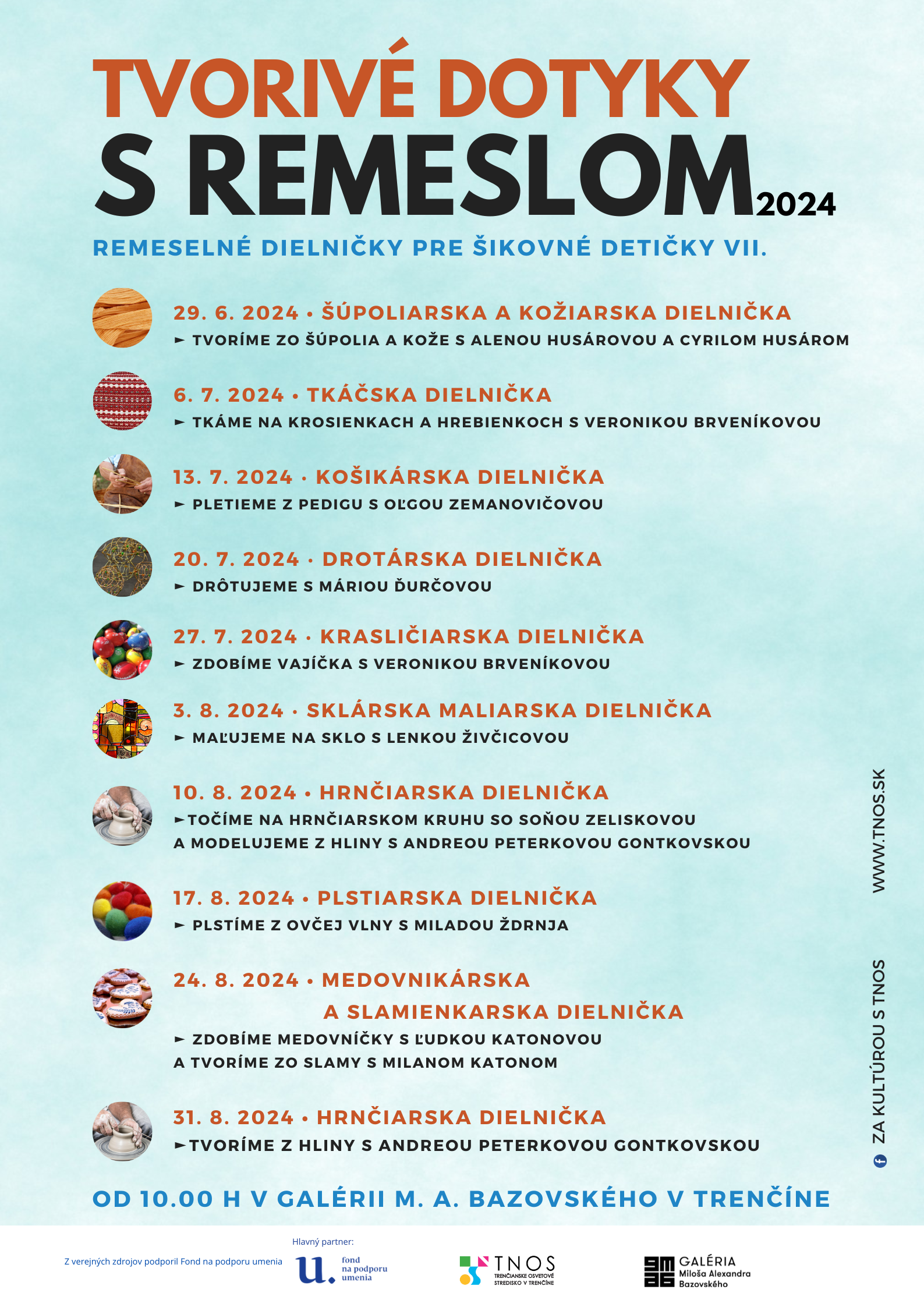Trenčianske osvetové stredisko v Trenčíne realizuje už siedmy ročník cyklu remeselných tvorivých dielničiek pre deti – TVORIVÉ DOTYKY S REMESLOM s cieľom poskytnúť priestor na vzdelávanie v oblasti ľudového umenia.