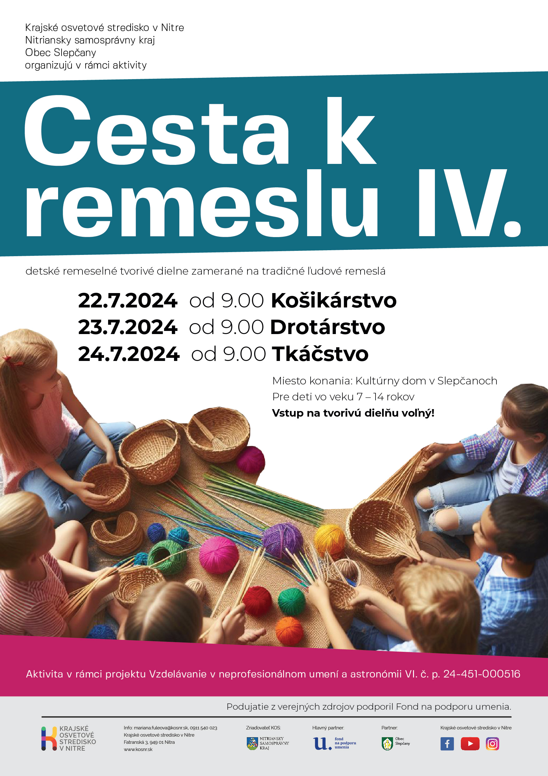 detské remeselné tvorivé dielne zamerané na tradičné ľudové remeslá - KOŠIKÁRSTVO, DROTÁRSTVO a TKÁČSTVO Kde: Kultúrny dom v Slepčanoch Lektorky: Mgr. Ľudmila Struková – košikárstvo Jeanette Imrová – drotárstvo Alena Kmeťová - tkáčstvo