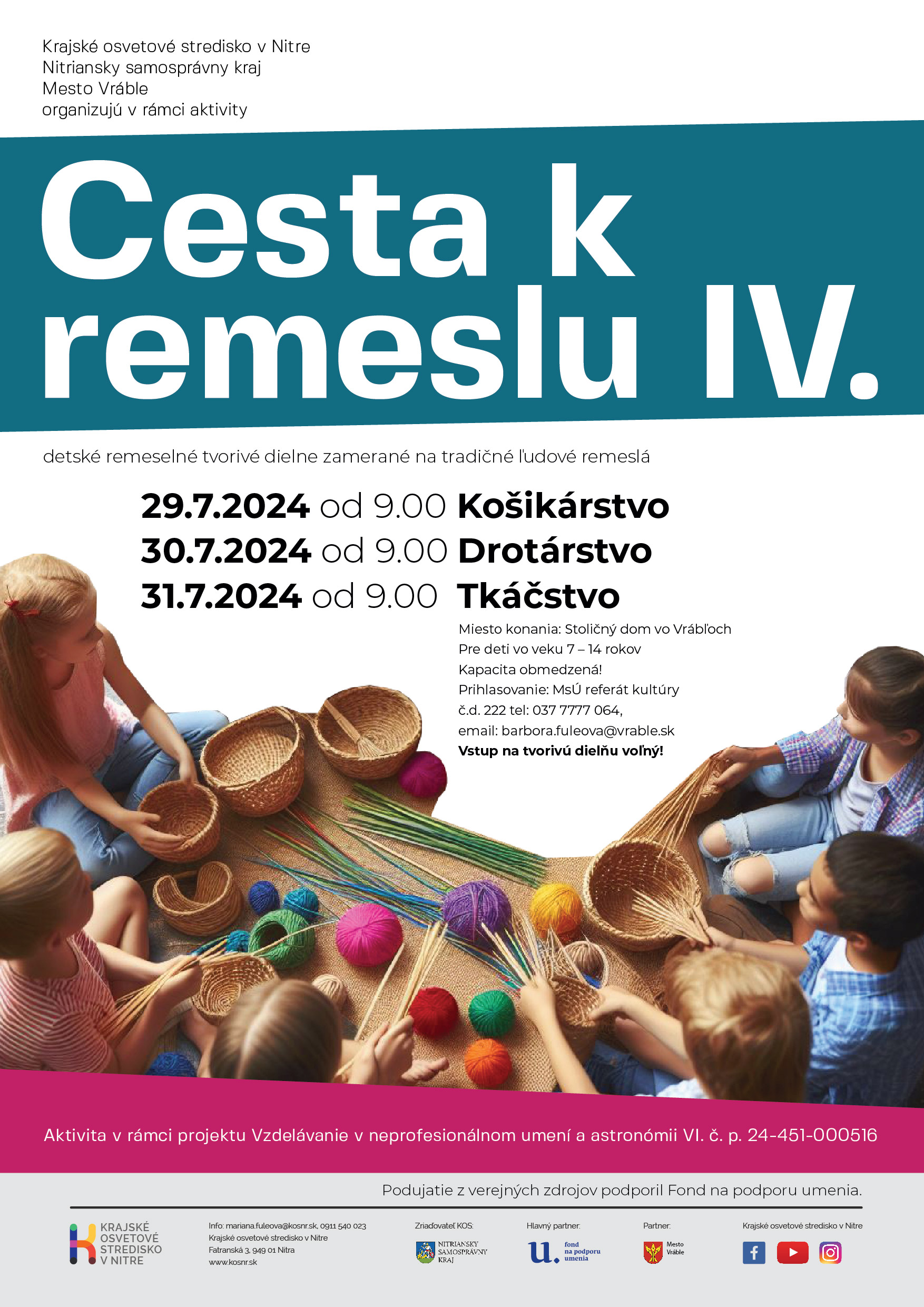 detské remeselné tvorivé dielne zamerané na tradičné ľudové remeslá - KOŠIKÁRSTVO, DROTÁRSTVO a TKÁČSTVO Kde: Stoličný dom vo Vrábľoch Lektorky: Mgr. Ľudmila Struková – košikárstvo Jeanette Imrová – drotárstvo Alena Kmeťová - tkáčstvo