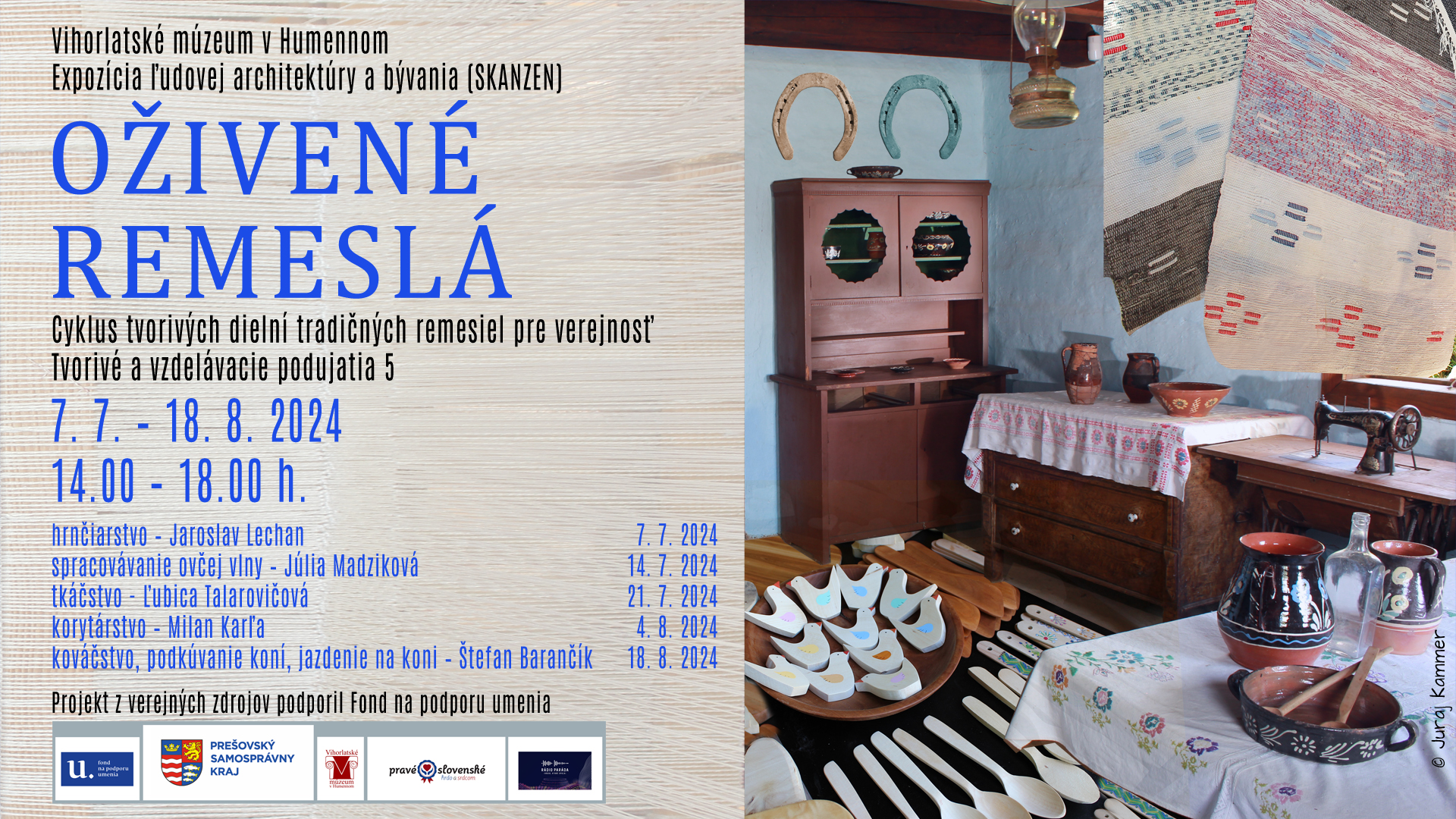 Pokračovanie úspešného cyklu tvorivých dielní tradičných remesiel pre širokú verejnosť. Počas piatich nedeľných popoludní budú remeselníkmi prezentované vybrané tradičné remeslá v prostredí Expozície ľudovej architektúry a bývania Vihorlatského múzea v Humennom. Prezentované remeslá: hrnčiarstvo, spracovávanie ovčej vlny, tkáčstvo, korytárstvo, kováčstvo, podkúvanie koní.