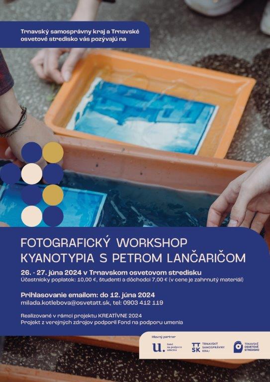 Trnavské osvetové stredisko v zriaďovateľskej pôsobnosti Trnavského samosprávneho kraja organizuje v dňoch 26. – 27. 6. 2024 vo výstavnej sieni a v exteriéri Domu hudby Mikuláša Schneidera Trnavského fotografický workshop KYANOTYPIA.
