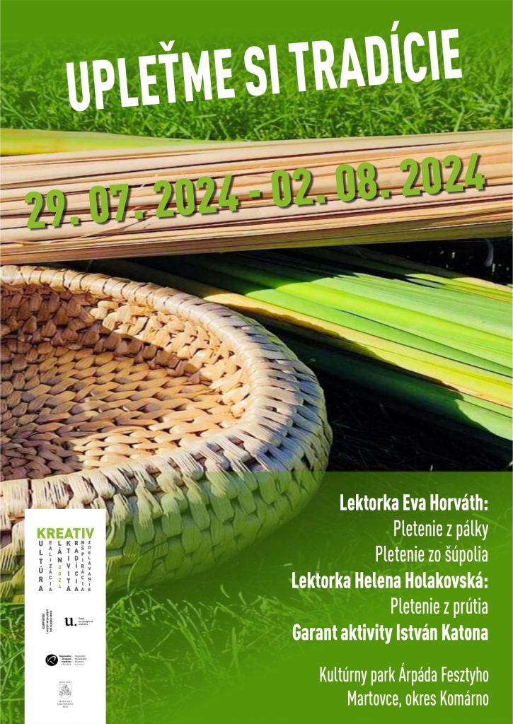Regionálne osvetové stredisko v Komárne – Regionális Művelődési Központ, Komárom realizuje pre záujemcov o tradičnú kultúru 5 jednodňových workshopov vzdelávacej aktivity pod názvom Upleťme si tradície v rámci projektu KREATIV 2024. Zamerané je na výučbu tradičných remesiel – pletenie z prírodných pletív (3 JW pletenie pálky, 1 JW pletenie prútia, 1 JW pletenie šúpolia) za účelom rozšírenia vedomostí a zručností; inšpirácie; oživenia, zveľaďovania a uchovávania tradičnej kultúry a remesiel.
