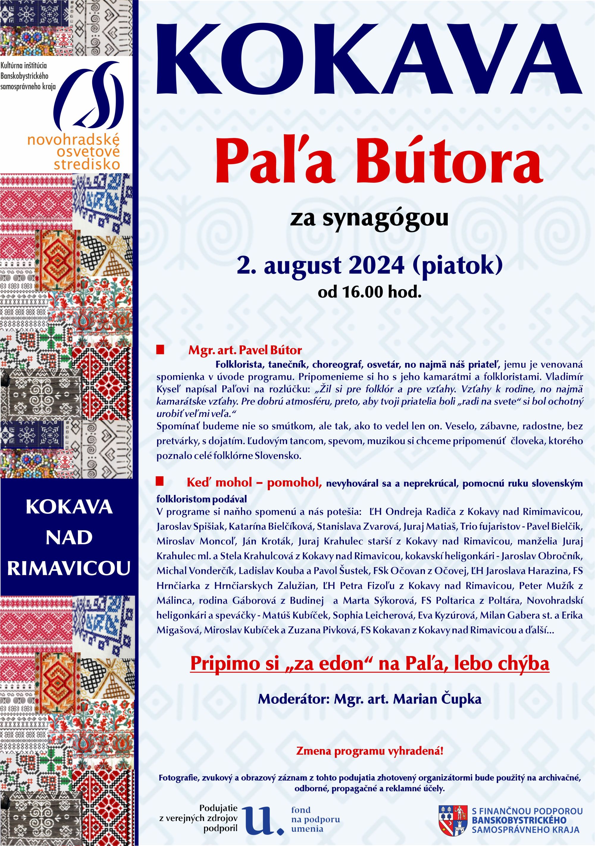 Podujatie venované prezentácii slovenského folklóru a pamiatke jeho významnej osobnosti, rodákovi z Kokavy nad Rimavicou - Pavlovi Bútorovi. Spomínať budeme veselo, zábavne, radostne, s ľudovým tancom a jeho vyhadzovanou, choreografiami, muzikou, kokavským jedlom, krojom či nárečím chceme pripomenúť človeka, ktorého poznalo celé folklórne Slovensko.
