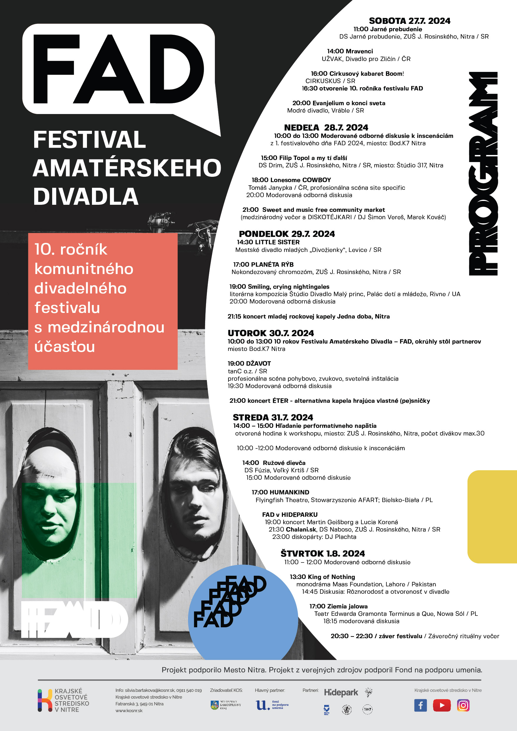 FAD 2024 – FESTIVAL AMATÉRSKEHO DIVADLA 10. ročník komunitného divadelného festivalu s medzinárodnou účasťou so zameraním sa na Site specific a fyzické divadlo FAD 2024 10. ročník komunitného divadelného festivalu s medzinárodnou účasťou 15 inscenácií zo SR, PL, ČR, UA a Pakistanu 6 workshopov Odborné diskusie Komunitný sprievodný program Okrúhly stôl s partnermi Výstavy: FAD v spomienkach