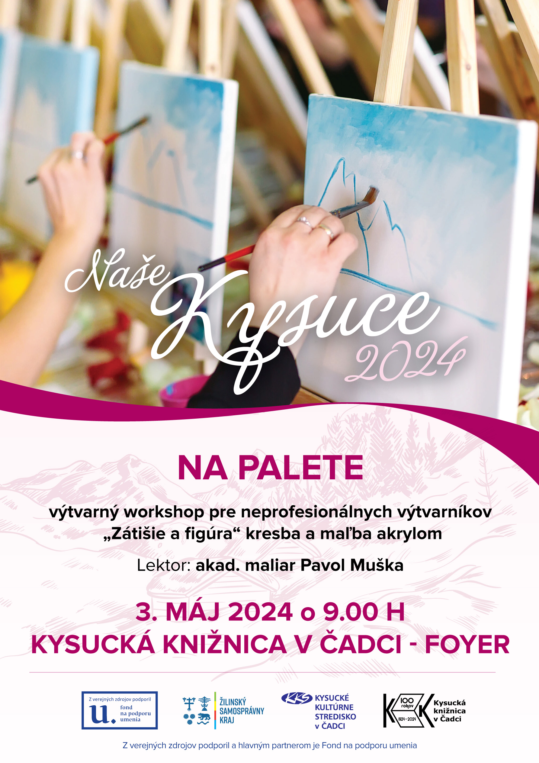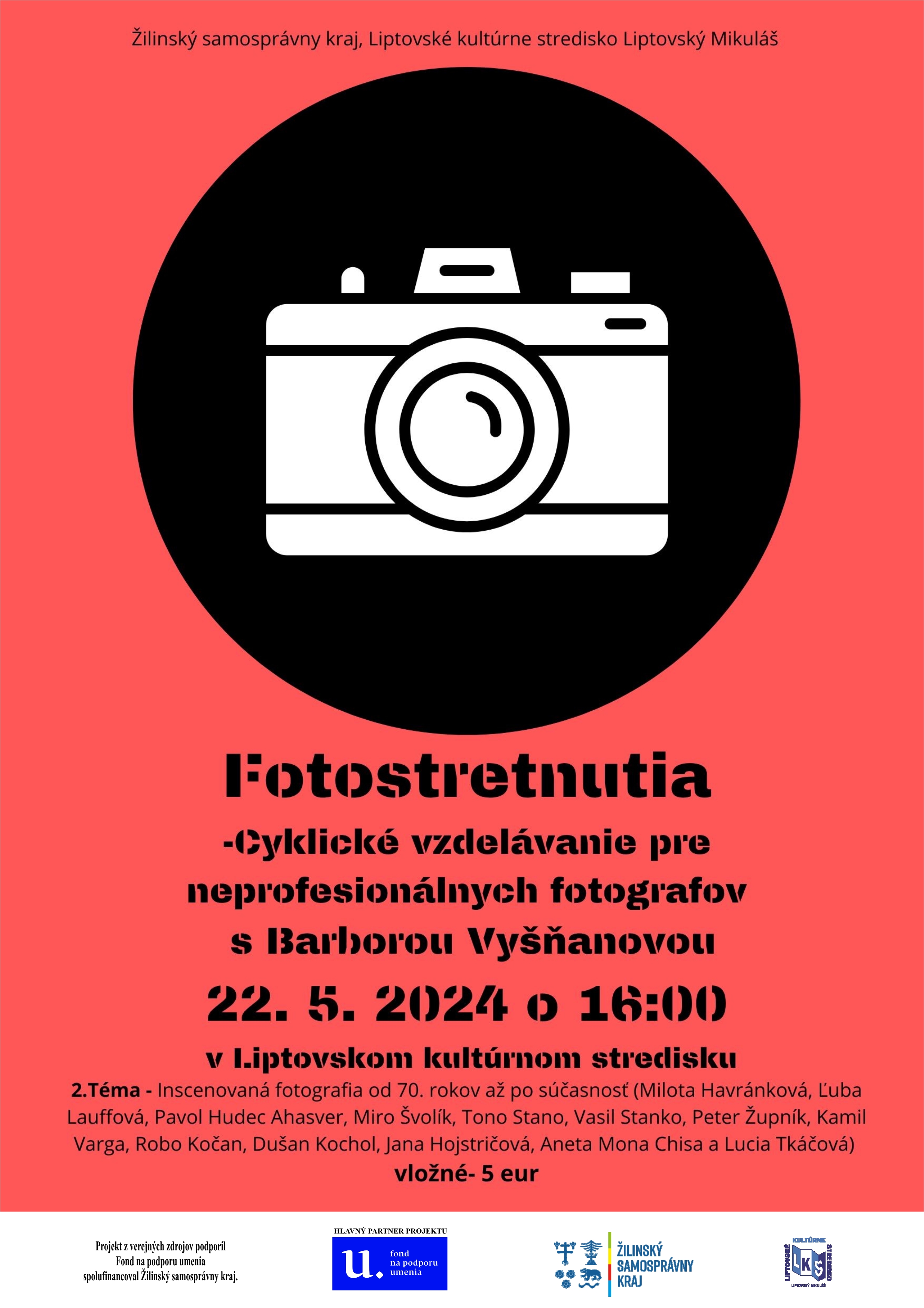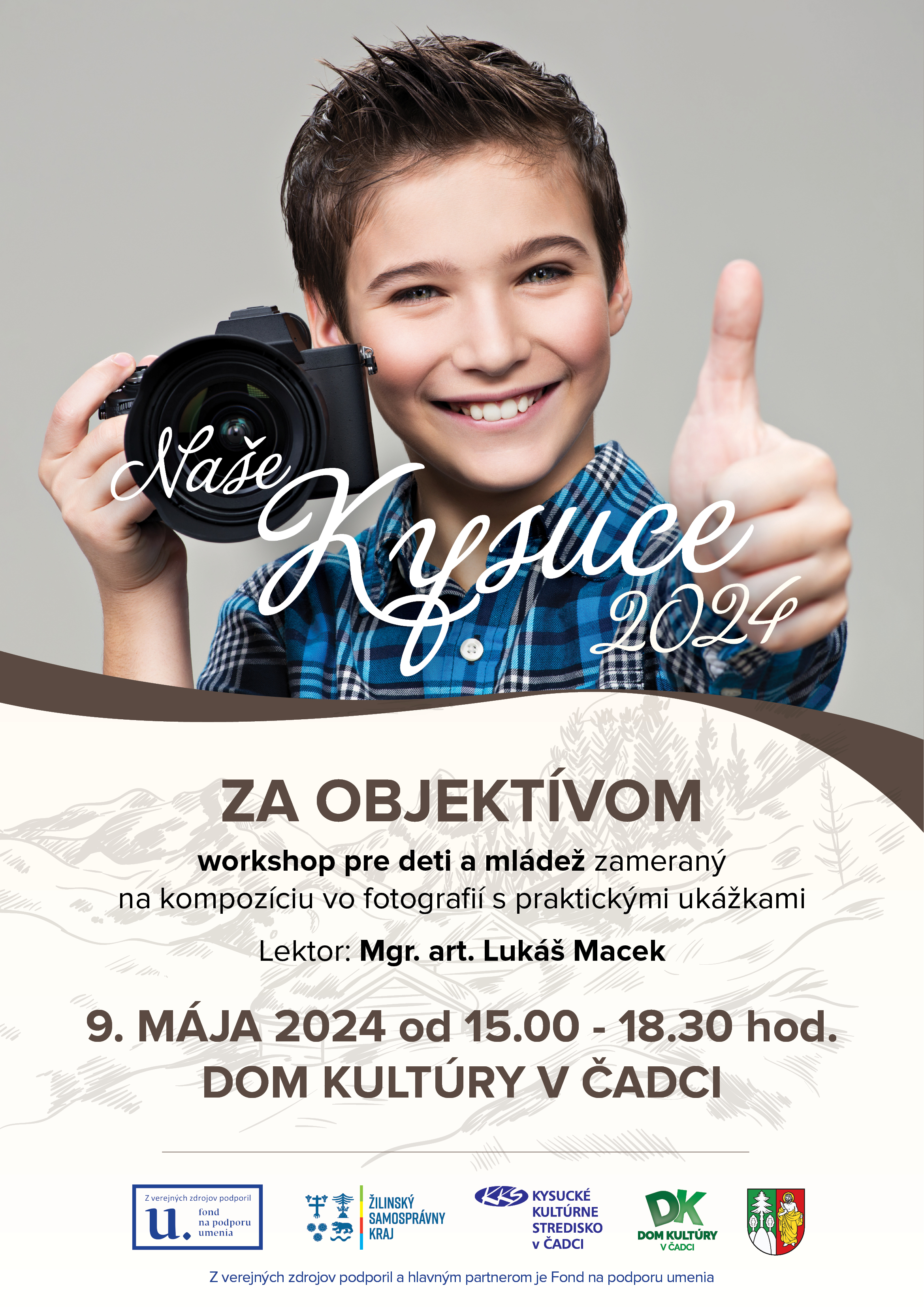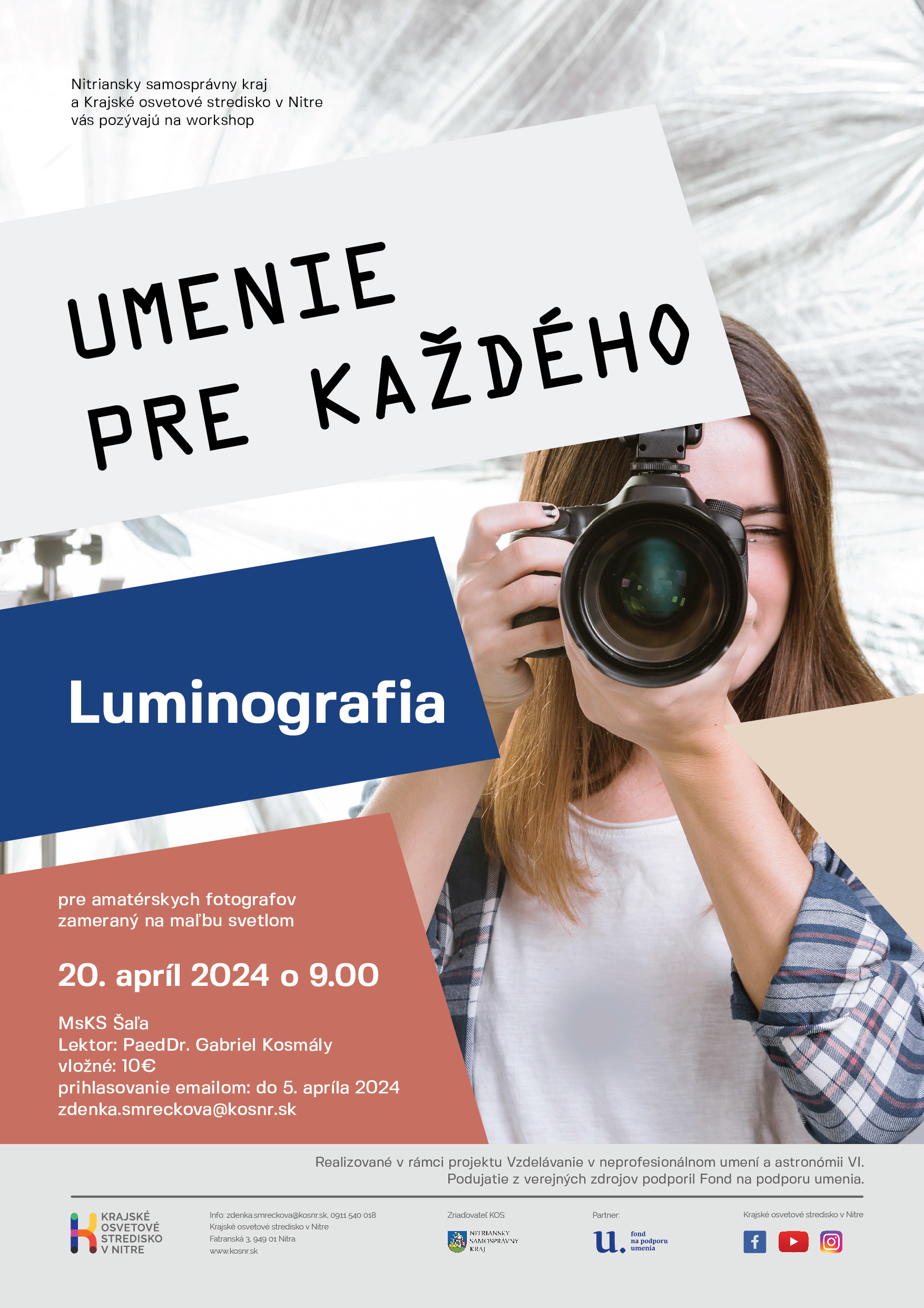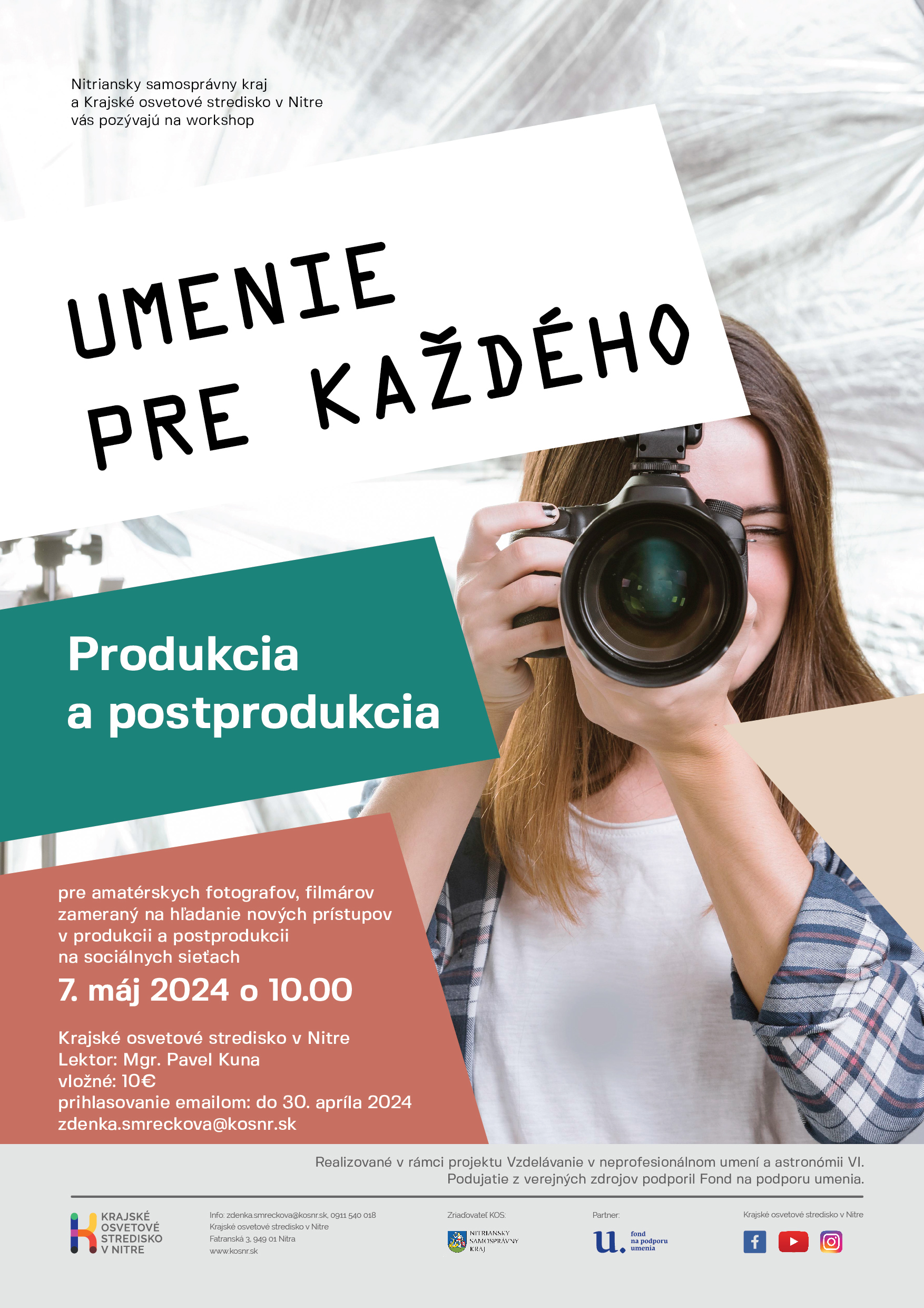 7. 5. 2024 10. 00 UMENIE PRE KAŽDÉHO - PRODUKCIA A POSTPRODUKACIA fotografický workshop pre amatérskych fotografov zameraný na hľadanie nových prístupov produkcie a postprodukacie fotografie, videa na sociálne siete lektor: Mgr. Pavel Kuna