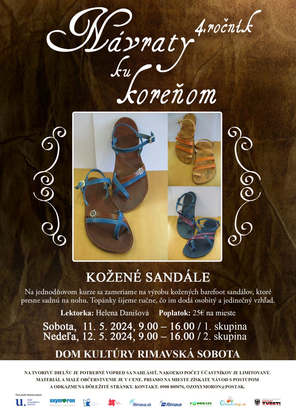 Jednodňový kurz výroby kožených barefoot sandálov, ktoré presne sadnú na nohu! V ponuke sú dva termíny: sobota, 11. 5. 2024, 9.00 – 16.00 / 1. skupina a nedeľa, 12. 5. 2024, 9.00 – 16.00 / 2. skupina. Topánky šijeme ručne, čo im dodá osobitý a jedinečný šarm. Lektorkou bude Helena Danišová z Rimavskej Soboty, remeselníčka a organizátorka kurzov na SK a v MR. Projekt z verejných zdrojov podporil Fond na podporu umenia.