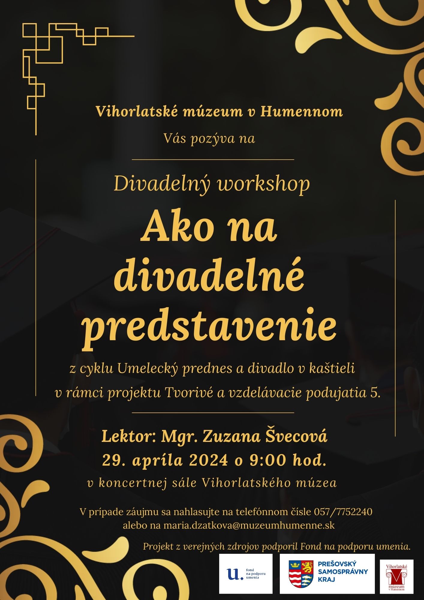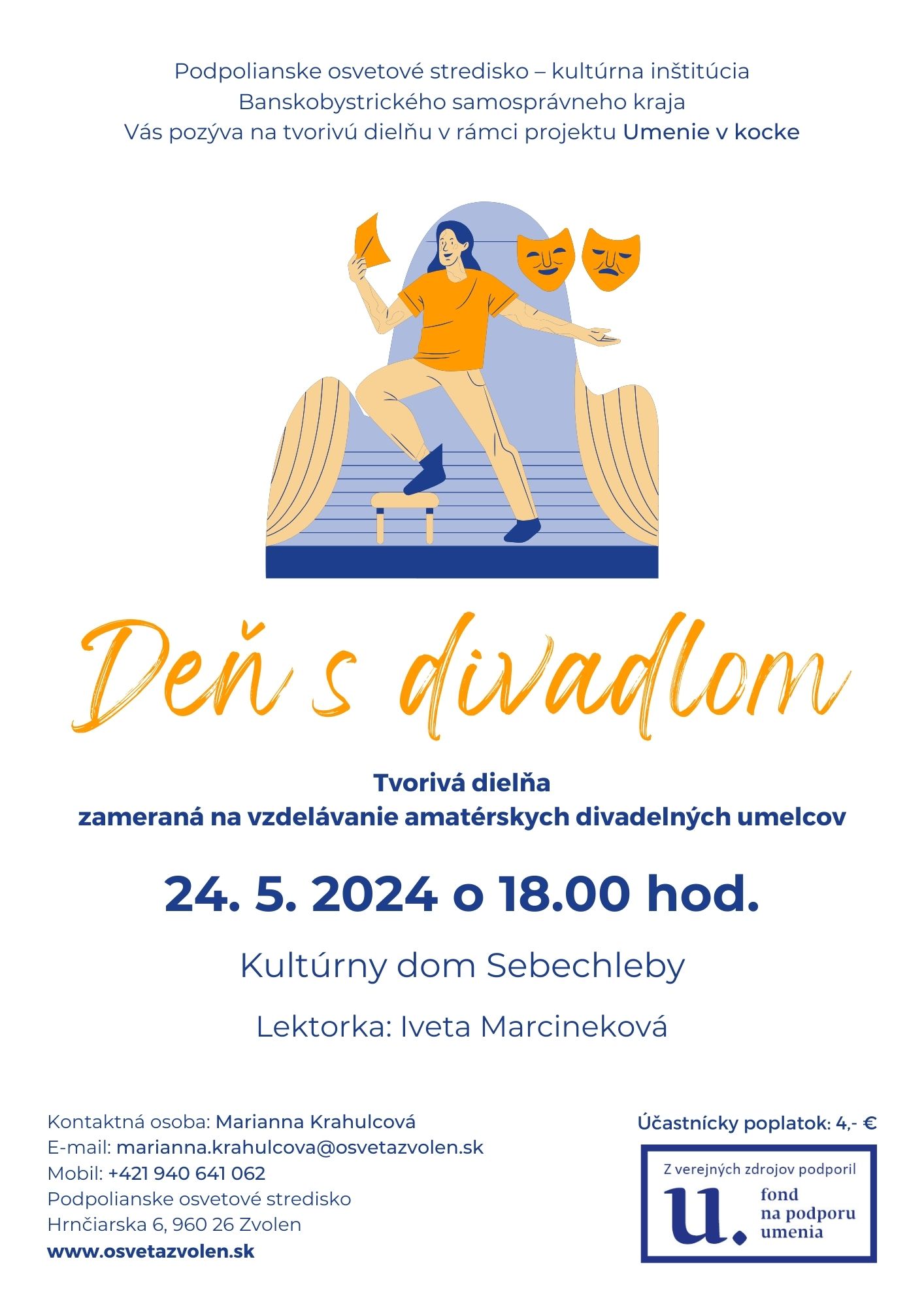 Divadelný workshop zameraný pre pedagógov ZŠ, SŠ, ZUŠ a amatérskych umelcov ponúkne záujemcom pestrú škálu poznatkov a spôsobov ako tvoriť na javisku a ako vytvoriť divadelné predstavenie.