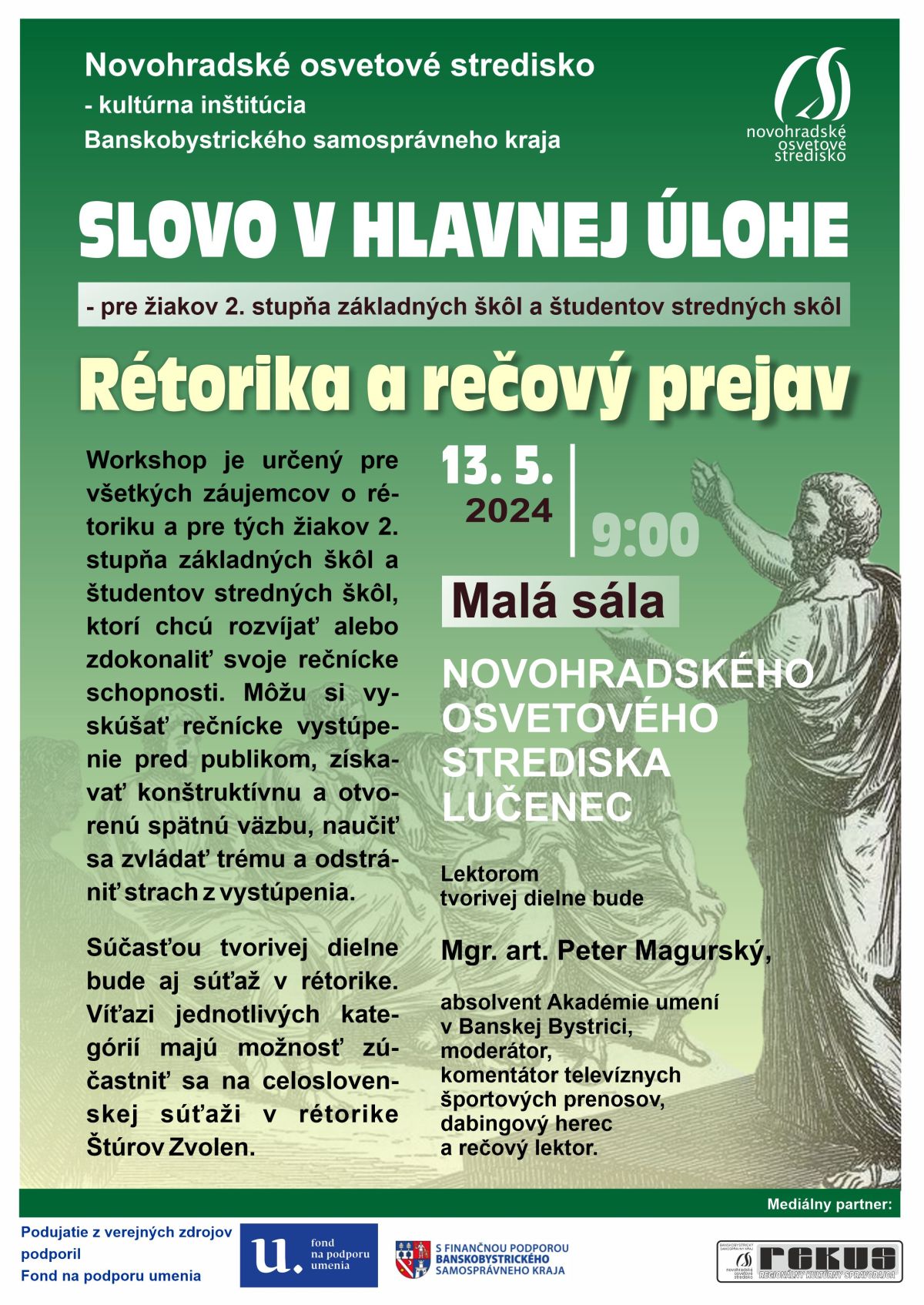 Tvorivá dielňa rétoriky bude zameraná na analýzu verbálneho prejavu účastníkov. Workshop pre začínajúcich moderátorov a záujemcov o rozvoj rečníckych schopností.