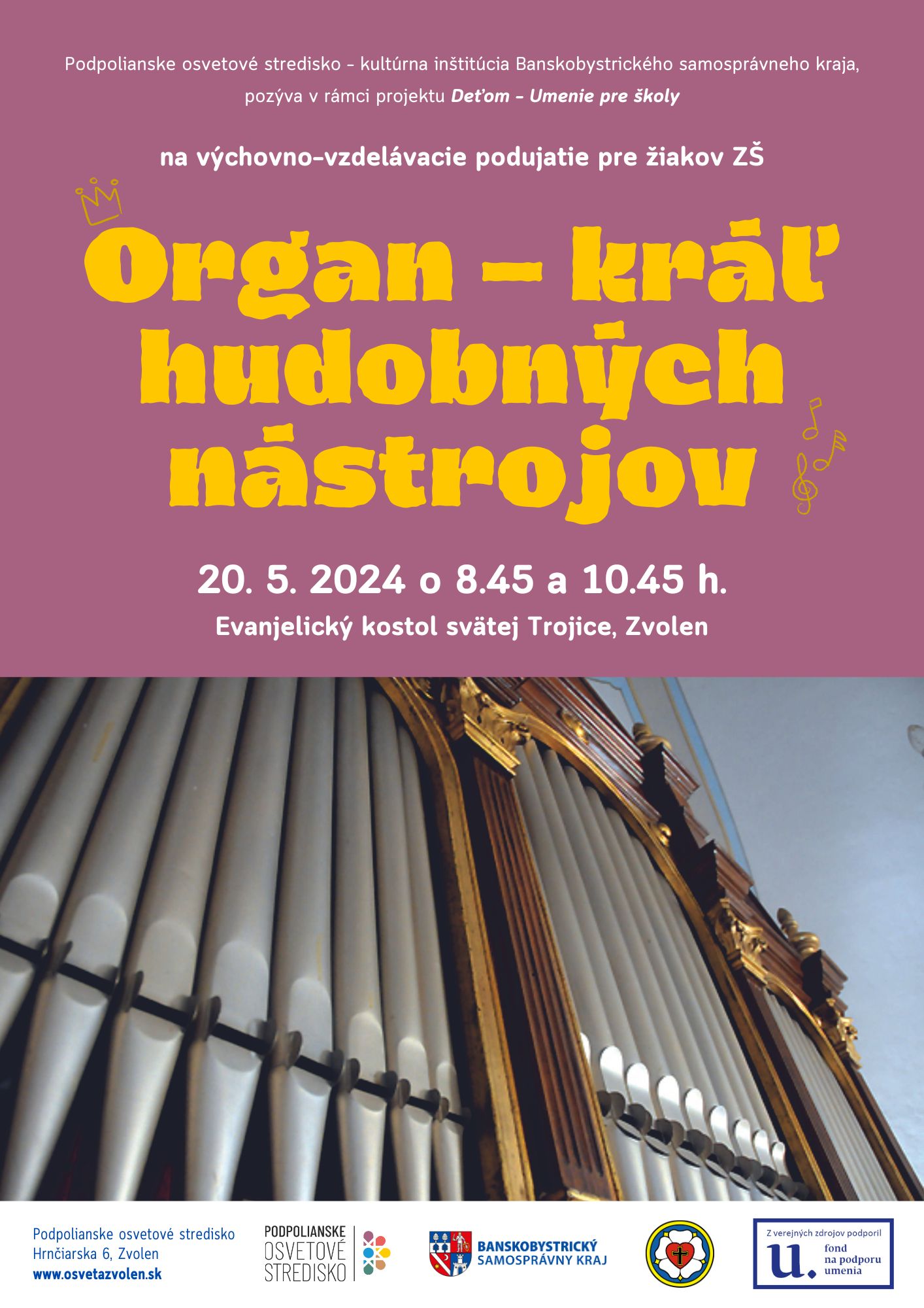 Organ - kráľ hudobných nástrojov: hudobno-vzdelávacie podujatie s cieľom sprostredkovať živú organovú hudbu a organ ako sólový a sprievodný koncertný hudobný nástroj v historickom i modernom ponímaní;