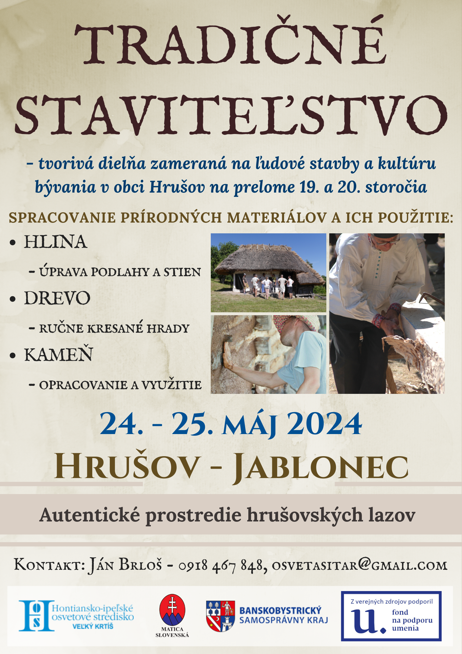Zámerom aktivity je predstaviť účastníkom tradičné technologické stavebné postupy na prelome 19. a 20. storočia a ich využitie v praxi. Tvorivá dielňa bude mať edukačný charakter vo vzťahu k ľudovým stavbám a kultúry bývania a bude prebiehať v autentickom prostredí hrušovskej lazníckej usadlosti, tzv. Brlošovej chyžky.