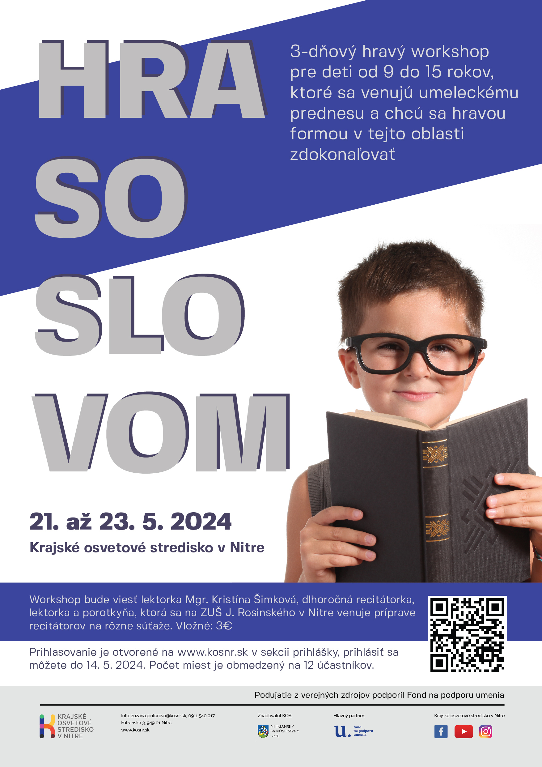 3-dňový workshop pre deti od 9 do 15 rokov, ktoré sa venujú umeleckému prednesu a chcú sa v ňom zdokonaľovať. Workshop bude viesť lektorka Mgr. Kristína Šimková, dlhoročná recitátorka, ktorá sa na ZUŠ J. Rosinského v Nitre venuje príprave recitátorov na rôzne súťaže.