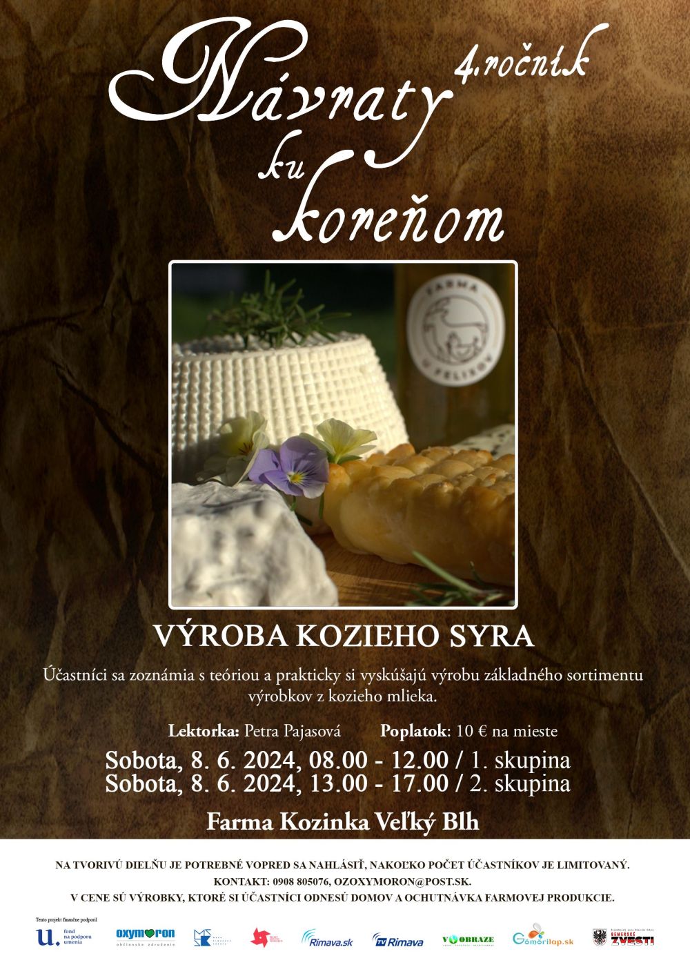Na treťom stretnutí projektu Návraty ku koreňom, 4. ročník navštívime v sobotu, 8. 6. 2024, 8.00 – 12.00 (1. skupina) a 13.00 - 17.00 hod. (2. skupina) farmu Kozinka vo Veľkom Blhu. Kurz pre začiatočníkov je zameraný na teoretické vedomosti - možnosti pasterizácie, využitie kultúr, syridiel, a pod. Prakticky si vyskúšame výrobu základného sortimentu výrobkov z kozieho mlieka. Lektorka: Petra Pajasová