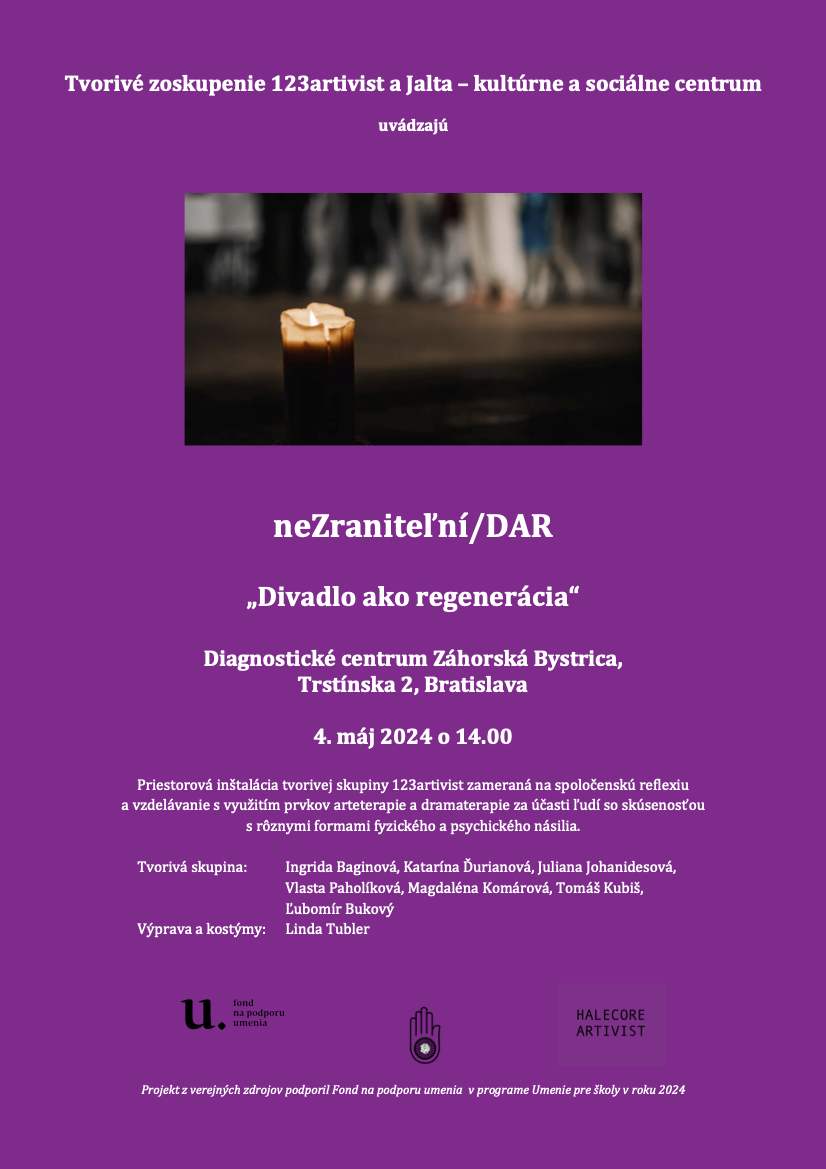 neZRANITEĽNÍ/DAR 2024 v DC Záhorská Bystrica Odštartovali sme novú sériu umelecko-vzdelávacích aktivít pre deti a mládež v špecializovaných zariadeniach, zameraných na poskytovanie vzdelávania a starostlivosti na Slovensku. Umenoterapeutickými aktivitami nadväzujeme na predchádzajúcu činnosť v šiestich reedukačných centrách v roku 2023 aj na základe pozitívneho ohlasu zo strany detí, mládeže, pomáhajúcich profesií i odborného personálu.