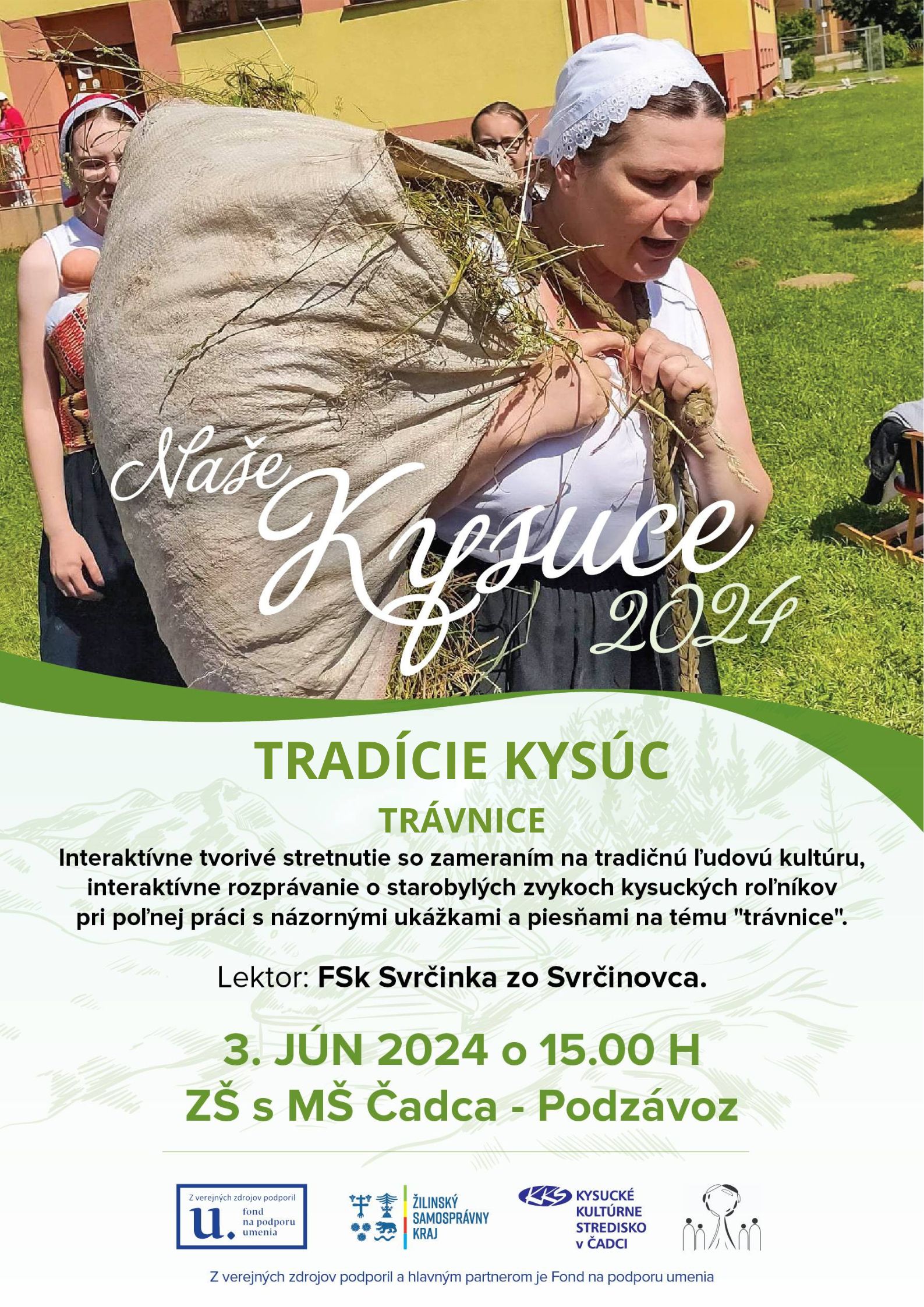 Tradície Kysúc: TRÁVNICE Interaktívne tvorivé stretnutie so zameraním na tradičnú ľudovú kultúru, interaktívne rozprávanie o starobylých zvykoch kysuckých roľníkov pri poľnej práci s názornými ukážkami a piesňami na tému "trávnice".