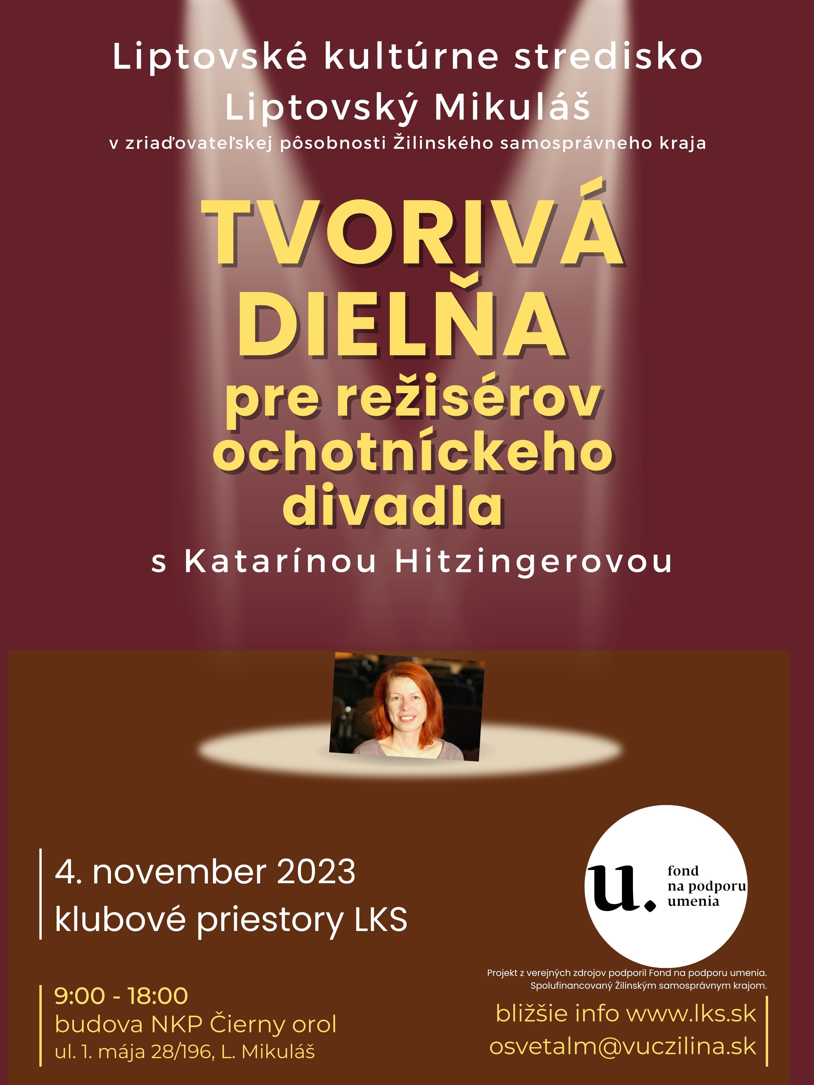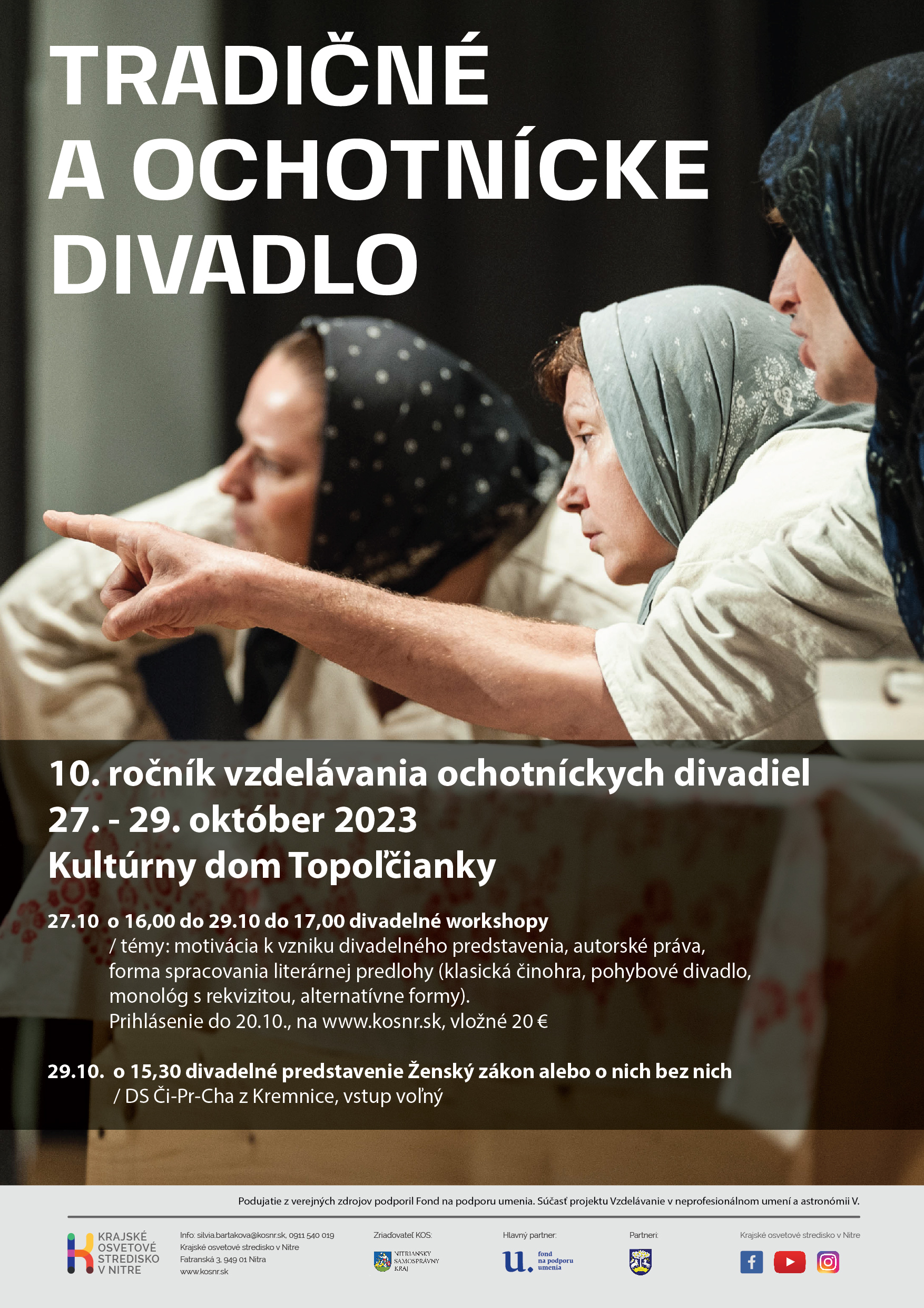 divadelné workshopy, 10. ročník vzdelávania ochotníckych divadiel, aktivizácia, edukácia ochotníckych divadelných súborov v Nitrianskom kraji s cieľom uchovávať tradíciu ochotníckych divadiel.
