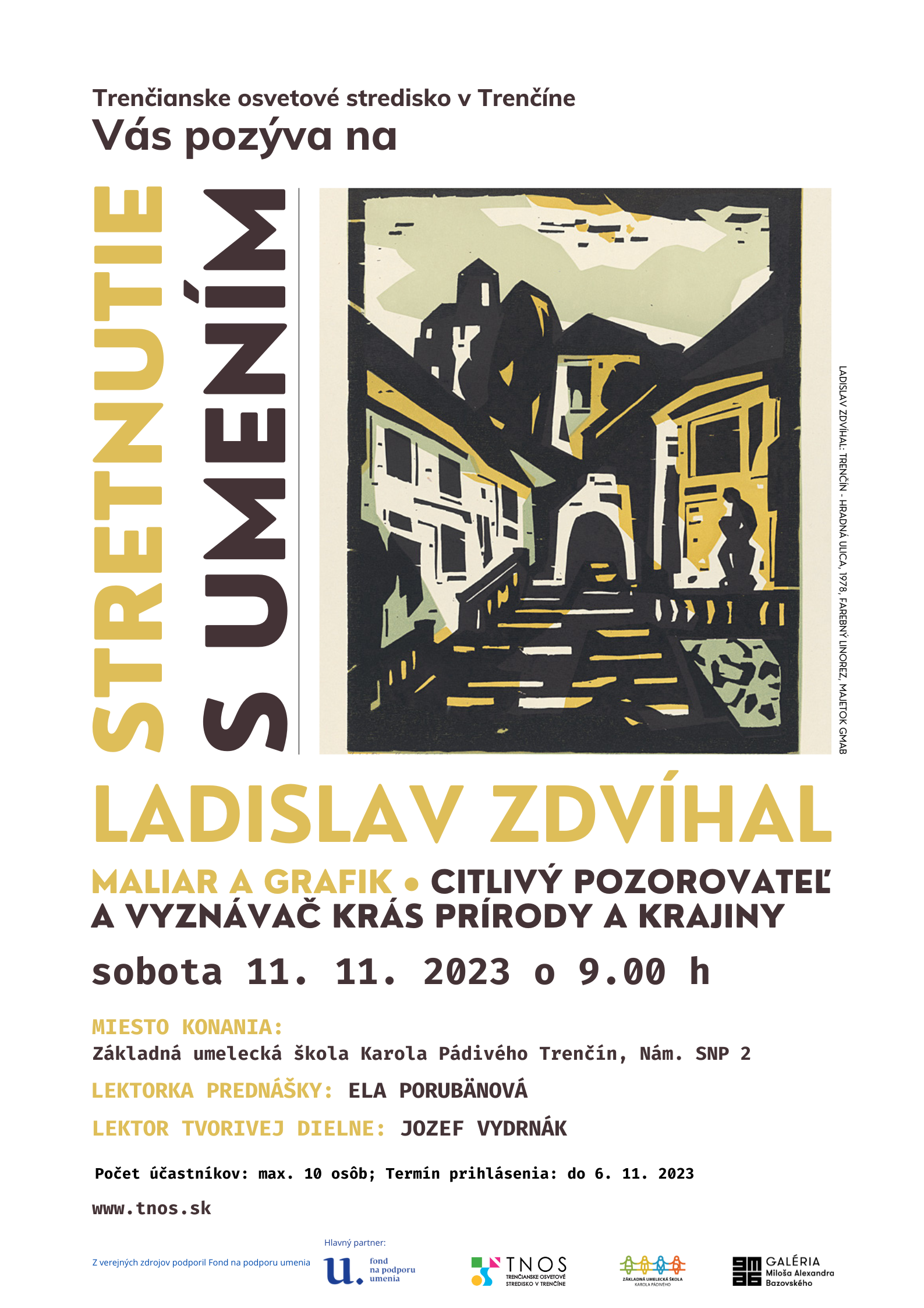 Trenčianske osvetové stredisko v Trenčíne Vás pozýva na druhé podujatie v rámci cyklu STRETNUTIE S UMENÍM, ktoré bude venované maliarovi, grafikovi LADISLAVOVI ZDVÍHALOVI citlivému pozorovateľovi a vyznávačovi krás prírody a krajiny.