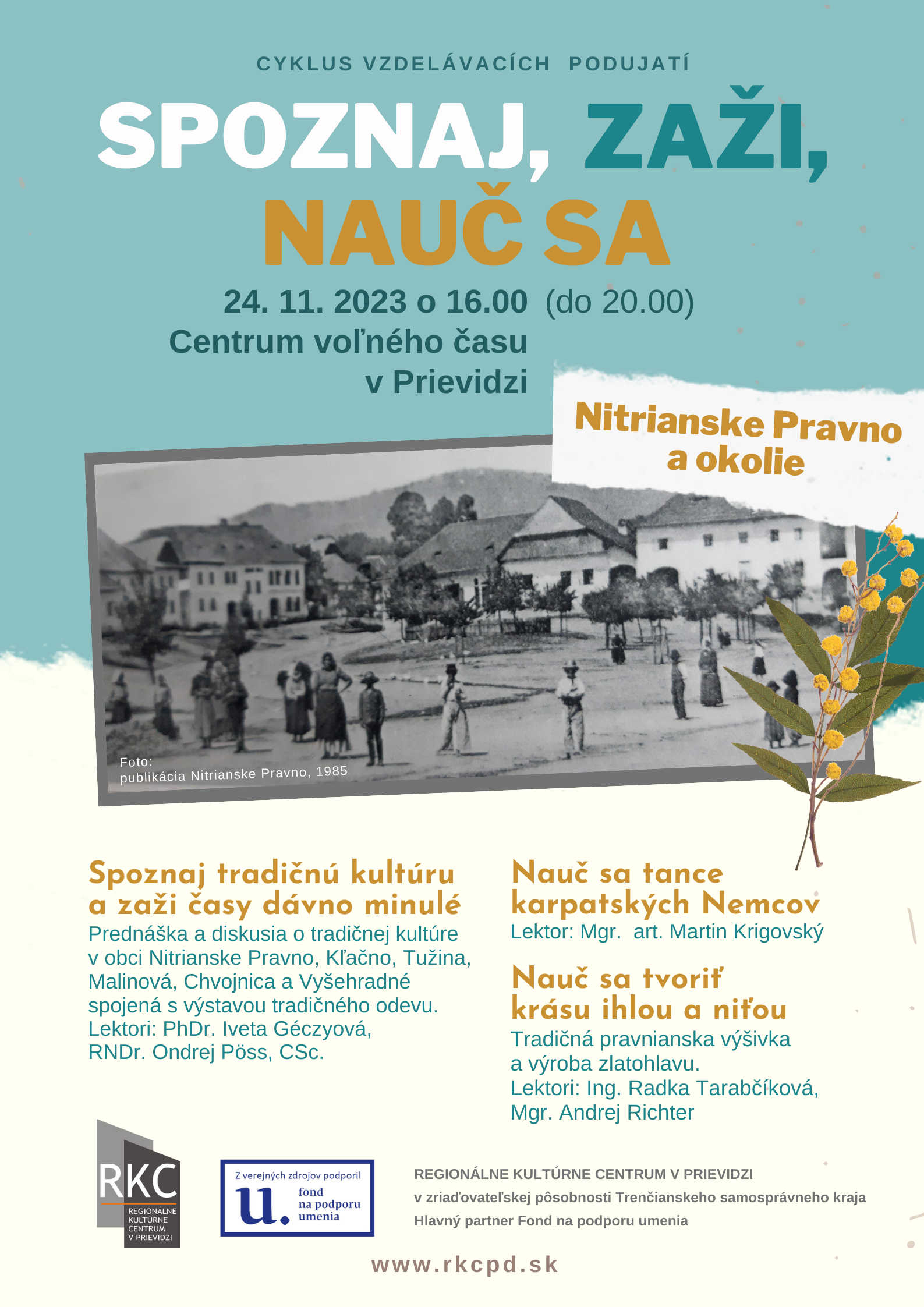 Tri jednodňové školiteľské podujatia pre folkloristov zamerané na pravniansku dolinu - etnologické prednášky, moderované diskusie, tanečný workshop, tvorivé a remeselnícke dielne.