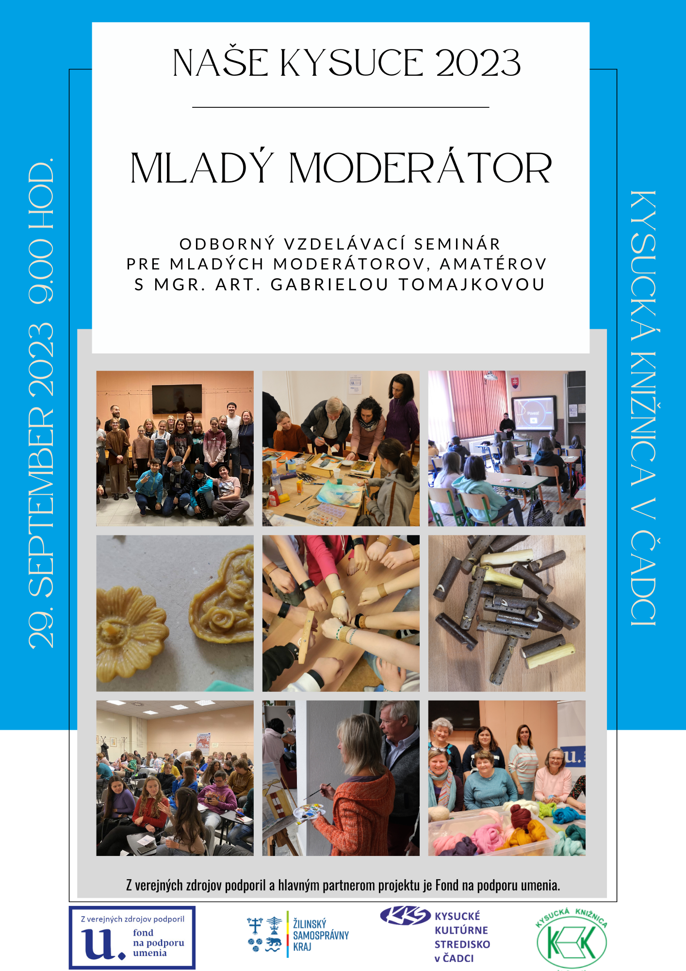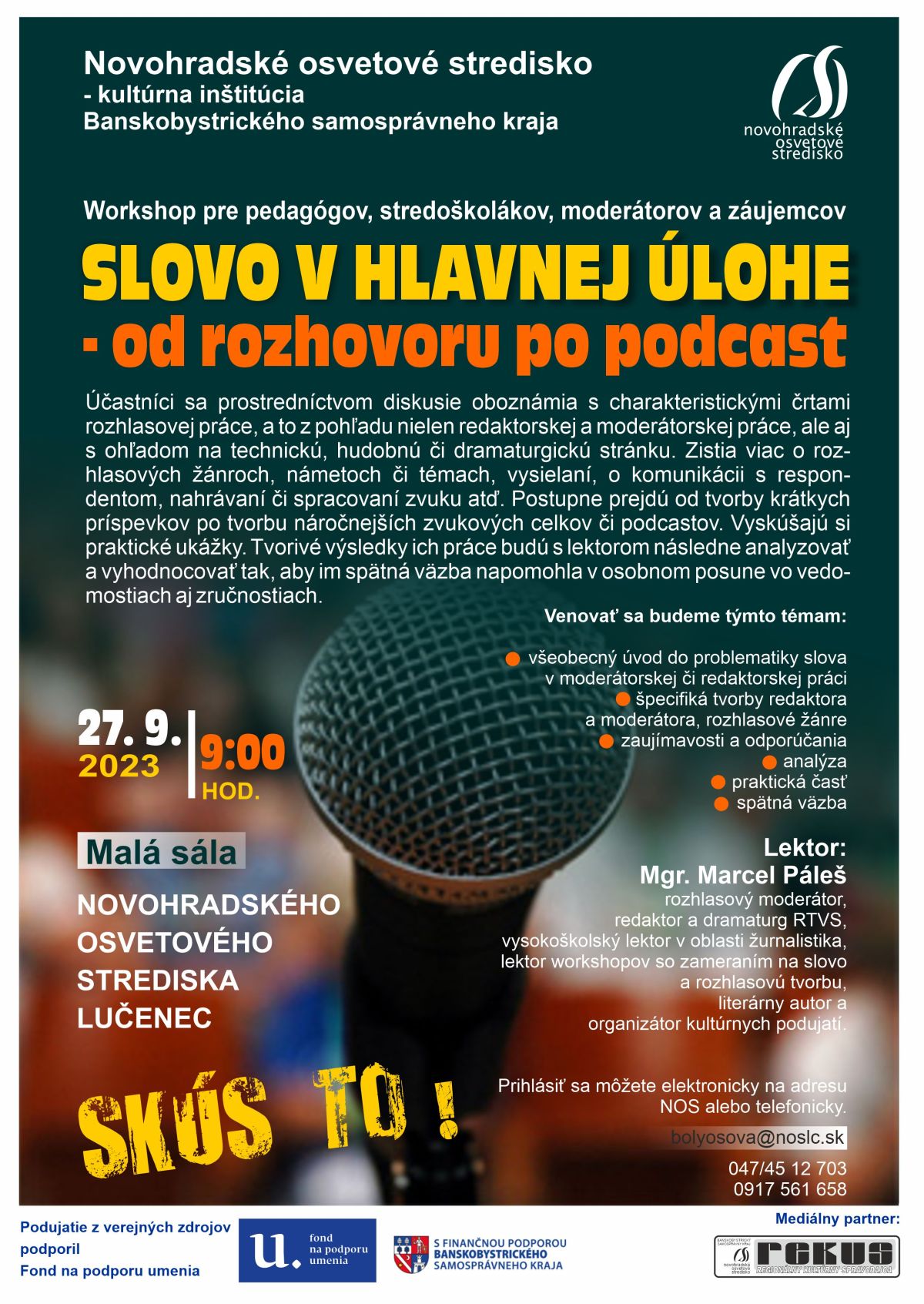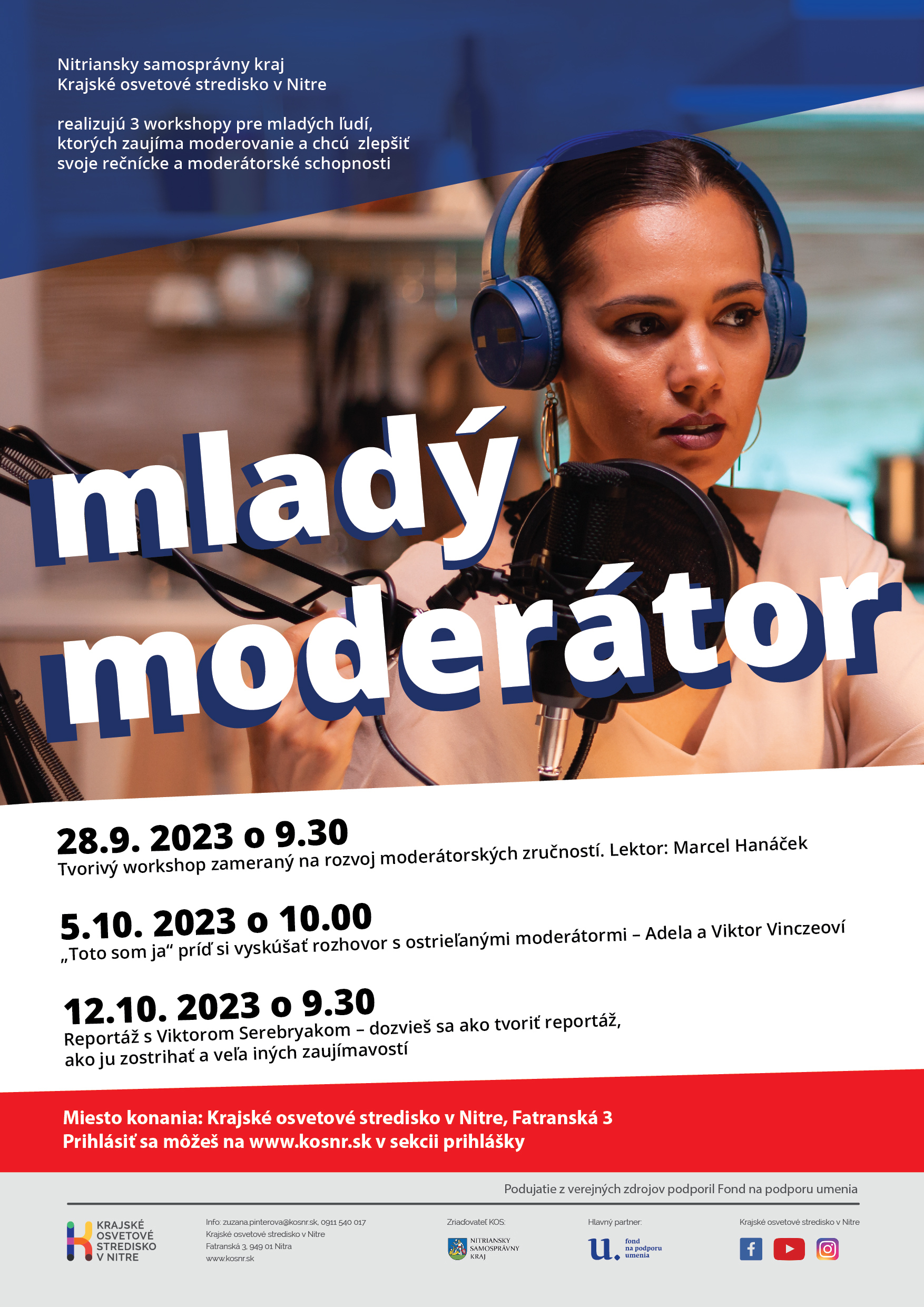 Tvorivý workshop zameraný na rozvoj moderátorských zručností, lektor Marcel Hanáček sa bude snažiť prihláseným študentom priblížiť všetkých 5 súťažných disciplín ku krajskej súťaži Mladý moderátor. Súťažné disciplíny - vlastná relácia, rozhovor, reportáž, reklamný a spravodajský text