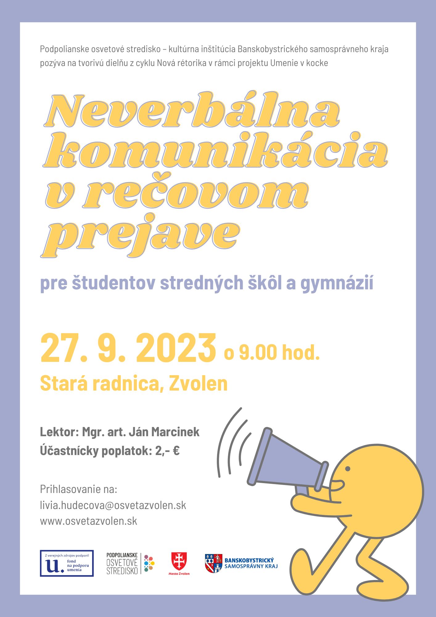 Rétorický workshop z cyklu Nová rétorika obsahovo zameraný na neverbálne aspekty prejavu rečníka. Workshop je určený pre študentov stredných škôl a gymnázií prípadne vyšších ročníkov základných škôl.