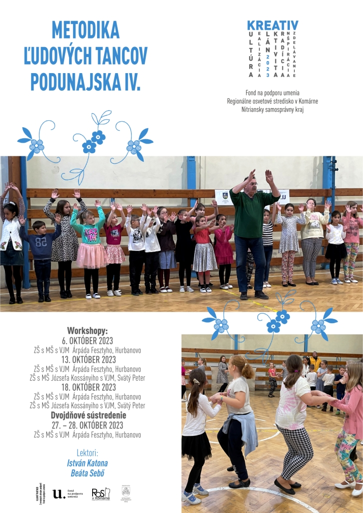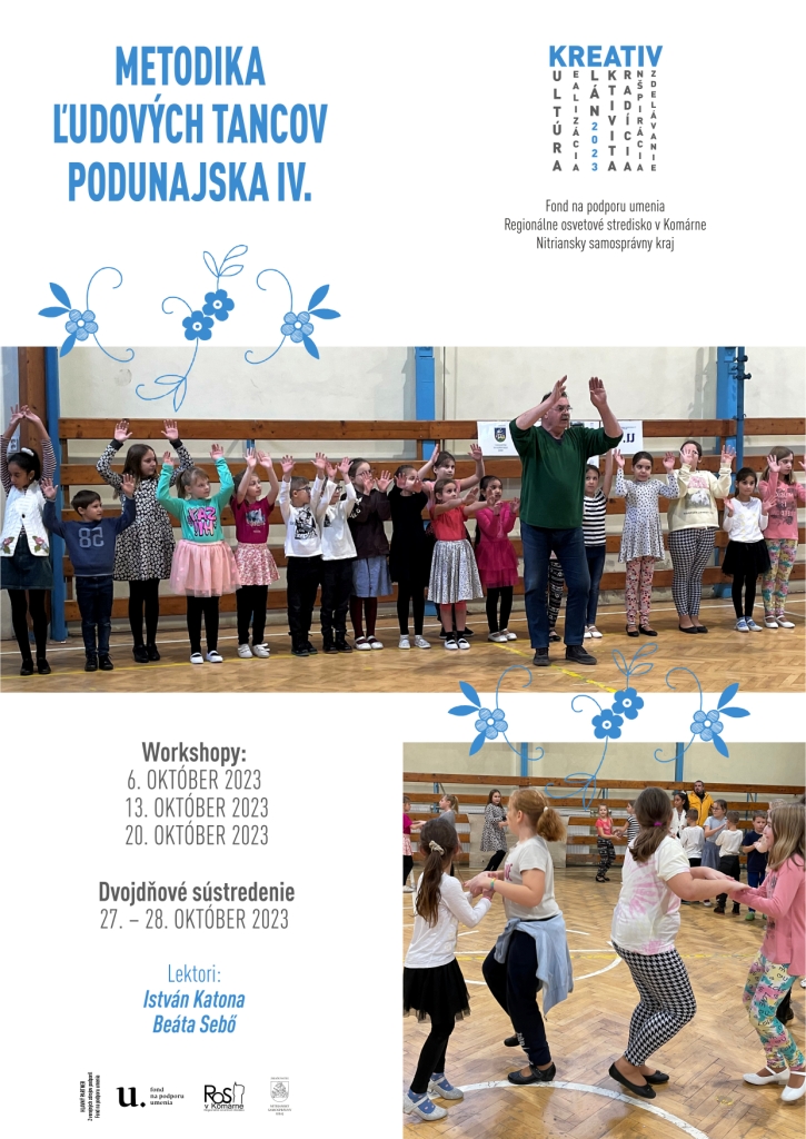 Regionálne osvetové stredisko v Komárne organizuje štvrtý ročník edukačného podujatia Metodika ľudových tancov Podunajska IV. v rámci projektu KREATIV 2023 pre pedagógov, vedúcich i členov folklórnych kolektívov. Cyklické vzdelávanie je zamerané na výučbu ľudového tanca vo folklórnych kolektívoch pre deti, mládež i dospelých; na informácie o vývoji tanečných tradícií v regióne Podunajska s úsilím o zveľaďovanie a uchovávanie prejavov tradičnej tanečnej ľudovej kultúry tohto regiónu.