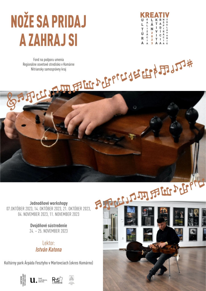 Regionálne osvetové stredisko v Komárne organizuje v rámci projektu KREATIV 2023 edukačné podujatie Nože sa pridaj a zahraj si, ktoré je určené deťom, dospelým; členom neprofesionálnych ľudových hudieb i folklórnych zoskupení Nitrianskeho kraja. Zamerané je na vzdelávanie v oblasti hudobného folklóru za účelom nadobudnutia nových vedomostí a zručností – hre na tradičné hudobné nástroje (gajdy, ninera, citara) s úsilím o zveľaďovanie a uchovávanie prejavov tradičnej ľudovej kultúry tohto regiónu.