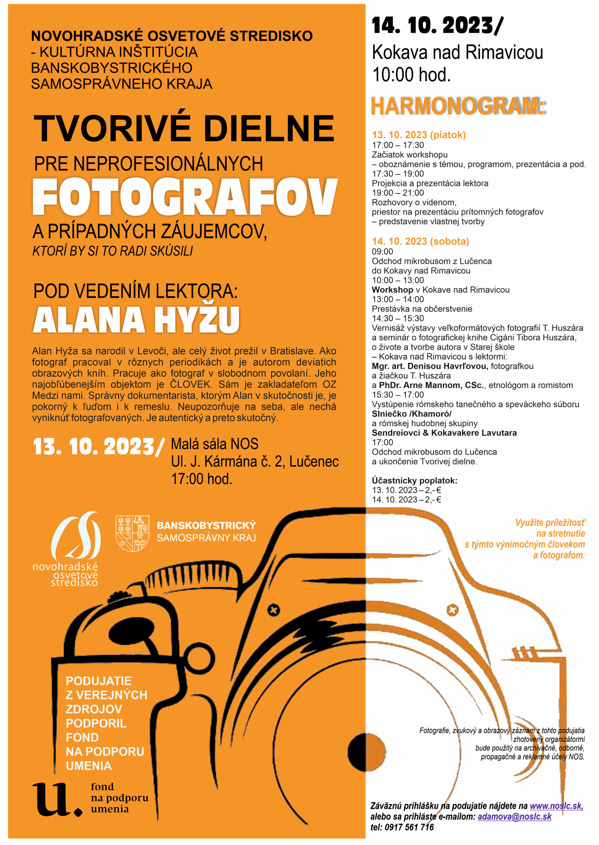 Workshop zameraný na tímovú prácu s dôrazom na spoločné vypracovanie témy, konceptu a metodiky fotografovania. Podľa témy bude vybrané prostredie ktoré poskytne množstvo námetov, motívov a prístupov k jej zobrazeniu. Pokúsime sa pracovať konceptuálne a máme v úmysle vytvoriť kolektívny výstup zobrazujúci rôznymi autorskými pohľadmi. Lektor Alan Hyža. Dňa 13.10.2023 v Lučenci a dňa 14.10.2023 v Kokave nad Rimavicou.