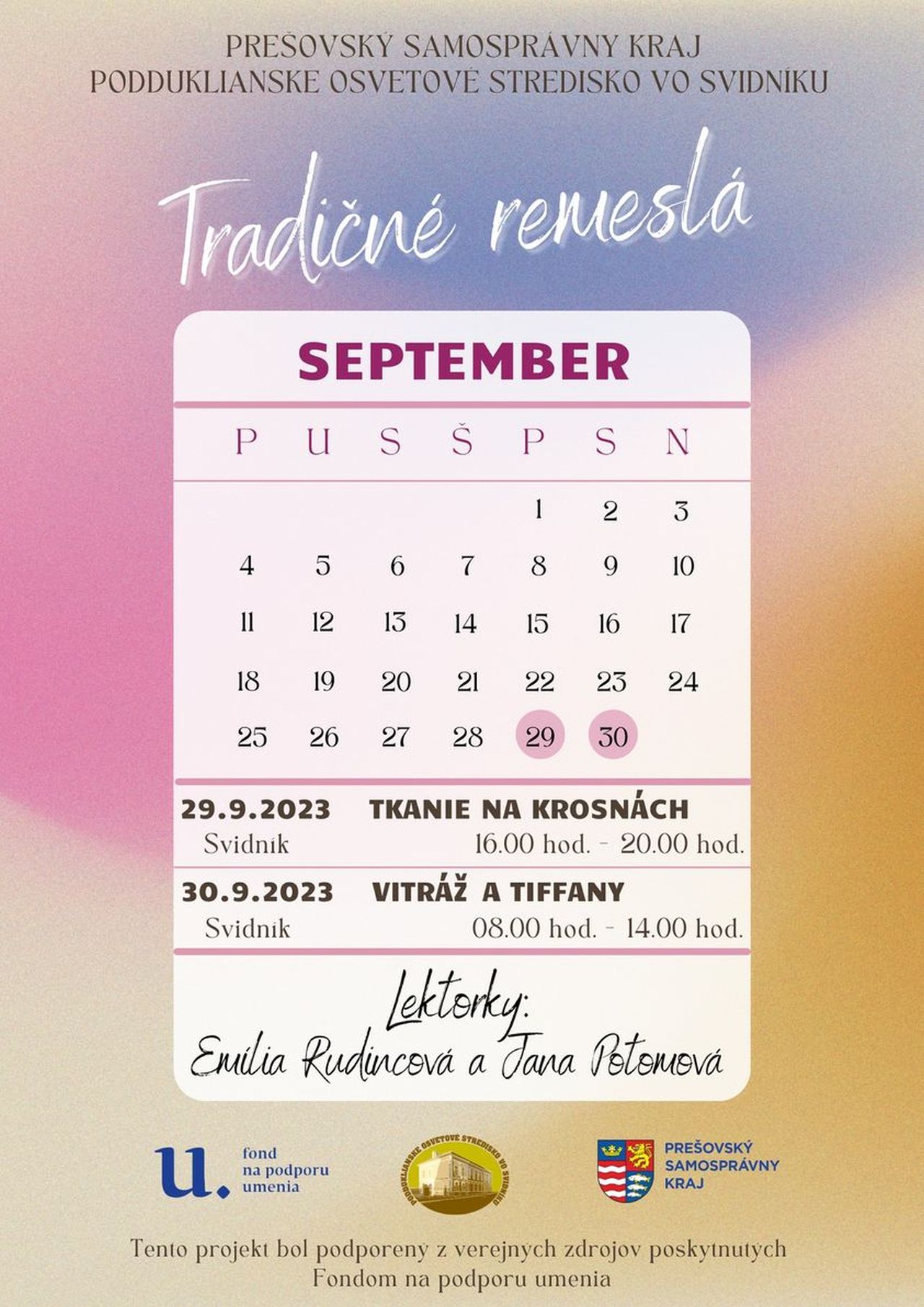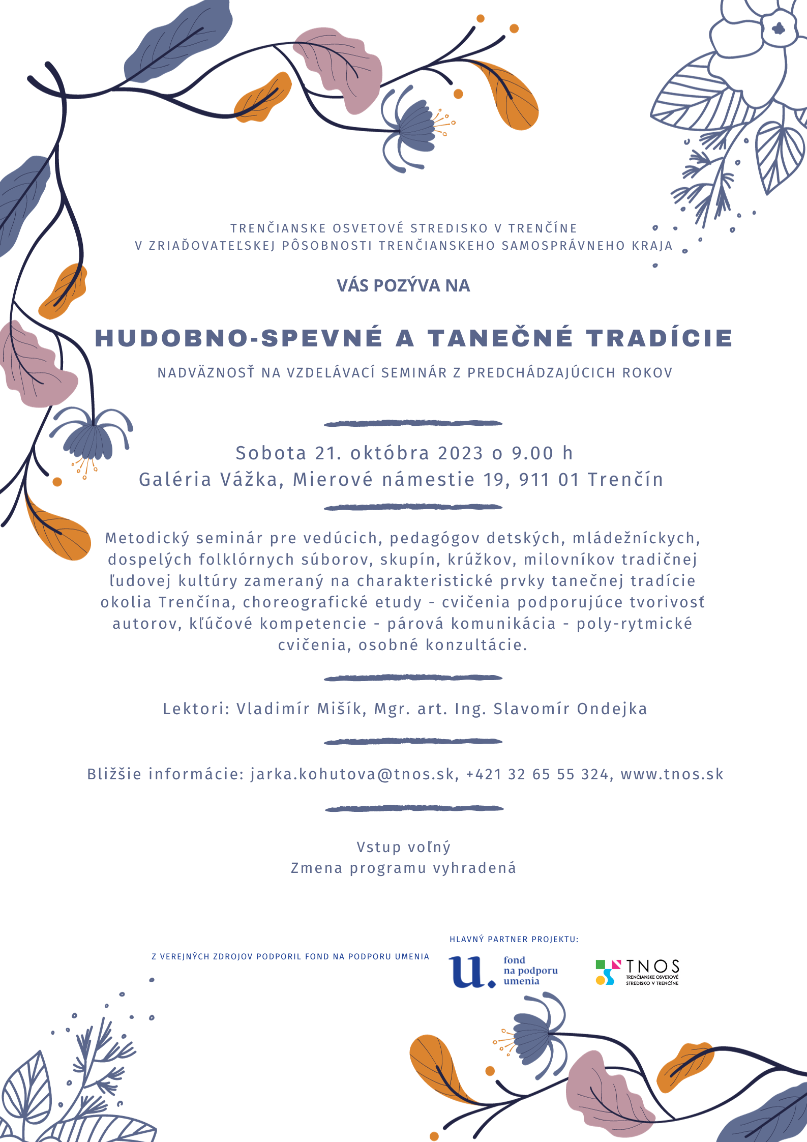 Trenčianske osvetové stredisko v Trenčíne Vás pozýva na vzdelávací seminár Hudobno-spevné a tanečné tradície pre pre vedúcich, pedagógov, detských, mládežníckych, dospelých folklórnych súborov, skupín, krúžkov, milovníkov tradičnej ľudovej kultúry zameraný na charakteristické prvky tanečnej tradície okolia Trenčína, choreografické etudy – cvičenia podporujúce tvorivosť autorov, kľúčové kompetencie – párová komunikácia – poly-rytmické cvičenia, osobné konzultácie.