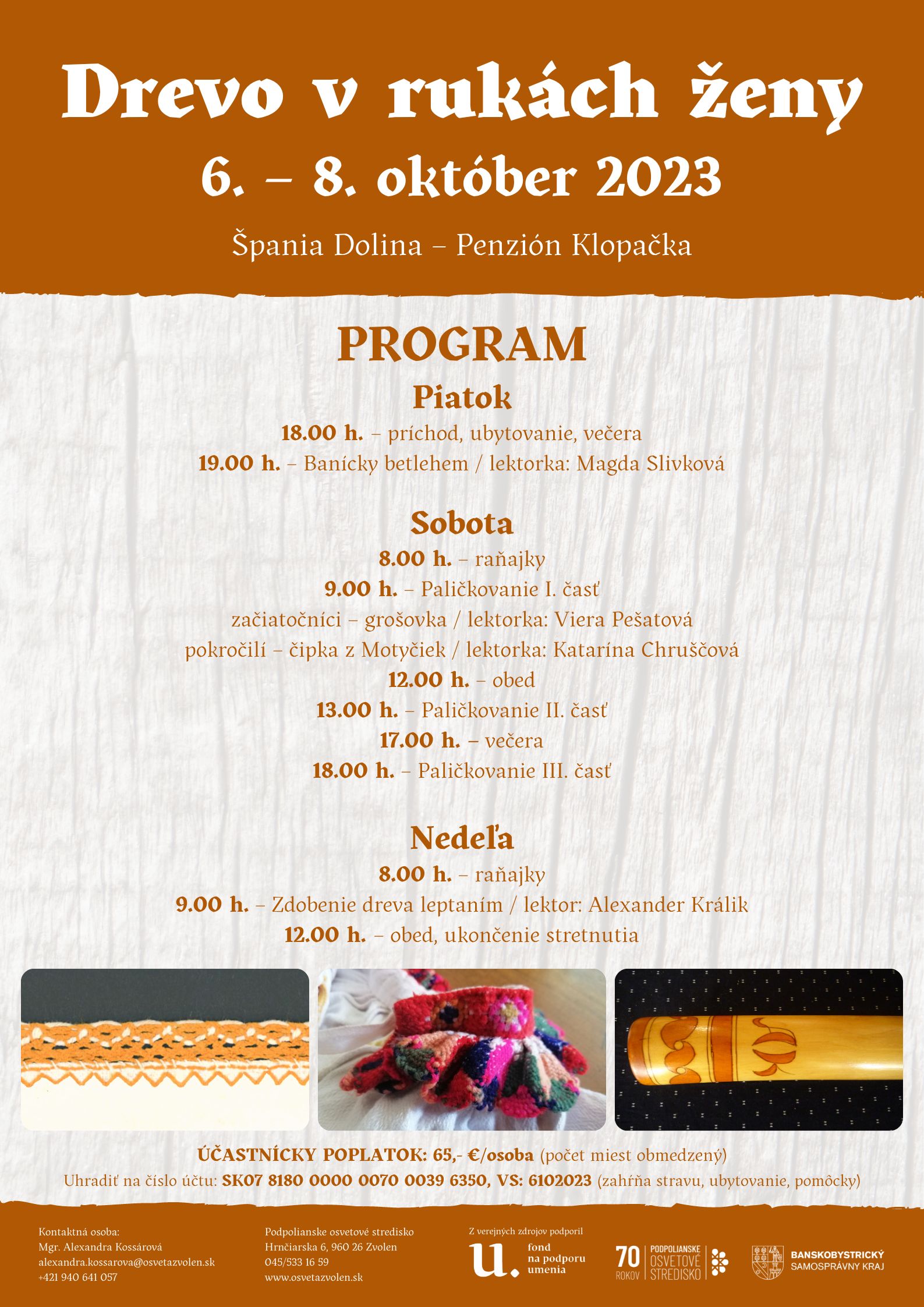 Drevo v rukách ženy je podujatie približujúce tradičné textilné techniky, kde sa využívali drevené pracovné nástroje, ale tiež aj rôzne drevospracujúce remeselné postupy. Zoznámime sa s tradíciou betlehemov v baníckych rodinách, vyrobíme si kašírovaného anjela. Sobota bude venovaná mnohopárovej čipke, pre začiatočníkov jednoduchšia sedempárová grošovka a pre pokročilých náročnejšie striedanie farieb. V nedeľu sa pohráme s drevom: budeme vyrezávať a leptať kyselinou.