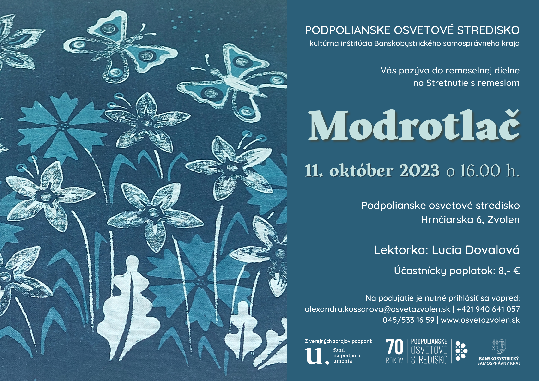 Srdečne vás pozývame do remeselnej dielne na Stretnutie s remeslom. V stredu 11.10. 2023 o 16.00 si s lektorkou Luciou Dovalovou vyskúšame starú techniku farbenia textilu – modrotlač. Dozvieme sa čo je reverzná tlač, pap, kypa, indigo... Výsledkom bude látka s vlastným vzorom.