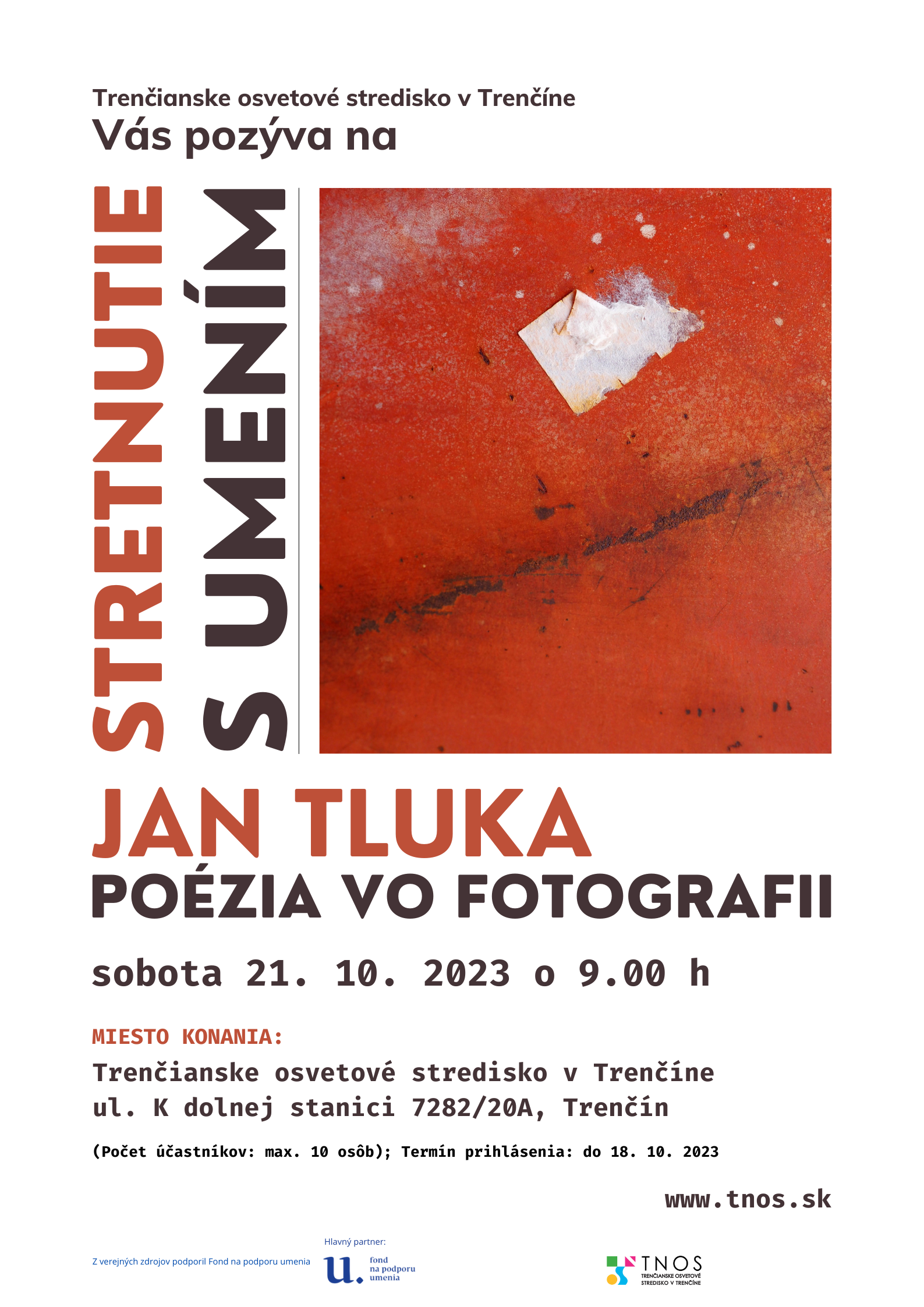 Trenčianske osvetové stredisko v Trenčíne Vás pozýva na prvé podujatie v rámci cyklu STRETNUTIE S UMENÍM zamerané na tému Jan Tluka a poézia vo fotograii.
