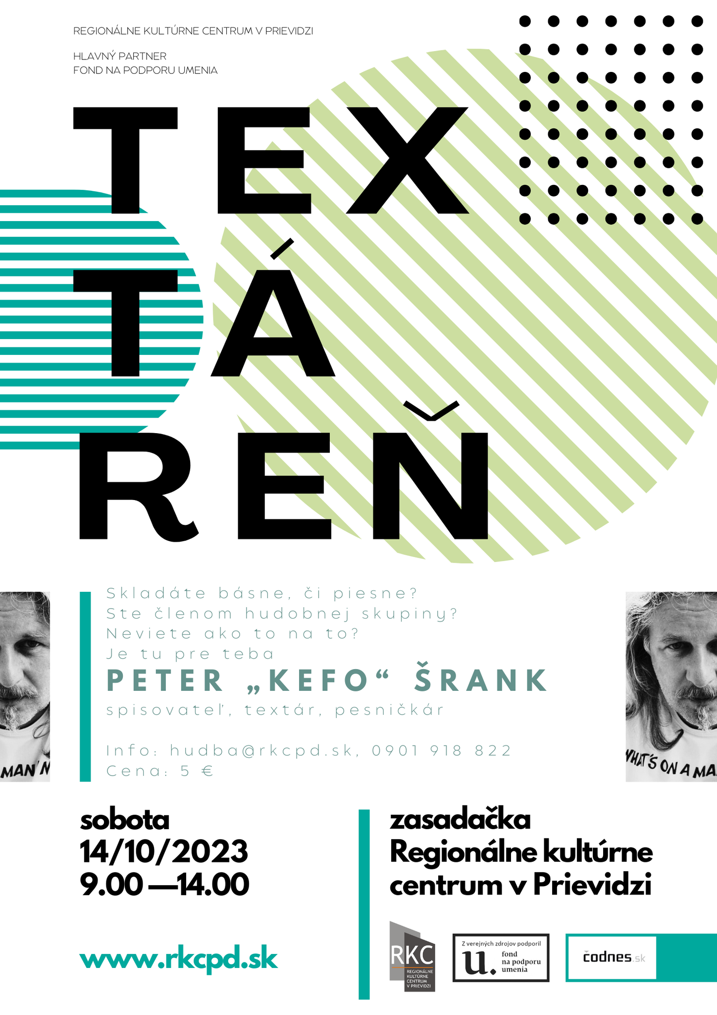 Workshop zameraný na písanie textov s názvom Textáreň sa uskutoční dňa 14. októbra 2023 od 9:00 h do 14:00 h v Regionálnom kultúrnom centre v Prievidzi.