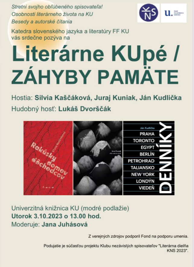 Literárne KUpé. Beseda a autorské čítanie na tému Záhyby pamäte. Hostia: S. Kaščáková, J. Kuniak, J. Kudlička