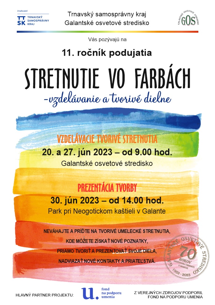 Galantské osvetové stredisko v rámci podpory vzdelávacích a kreatívnych aktivít organizuje v poradí 11. ročník tvorivo-prezentačných podujatí pod názvom Stretnutie vo farbách. Projekt z verejných zdrojov podporil Fond na podporu umenia, ktorý je zároveň aj hlavným partnerom projektu. Zámerom podujatí je podnietiť a začleniť záujemcov o umeleckú činnosť do nových aktivít, podporiť výmenu názorov a skúseností ako aj nabrať inšpiráciu pre ďalšiu tvorivú činnosť zúčastnených autorov.