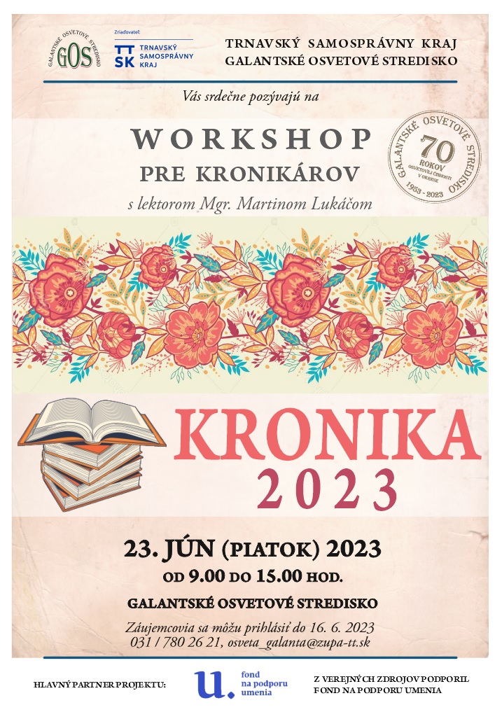 Galantské osvetové stredisko je dlhoročným realizátorom úspešných workshopov pre obecných a mestských kronikárov. Prvé z dvojice tohtoročných stretnutí sa bude konať dňa 23. júna 2023 v priestoroch Galantského osvetového strediska. Podujatie z verejných zdrojov podporil Fond na podporu umenia, ktorý je aj hlavným partnerom podujatia. Kronikárske workshopy uskutočňované v Galante napomáhajú edukácii účastníkov a sú dôležitým faktorom pri prehlbovaní kvality kronikárskej práce.