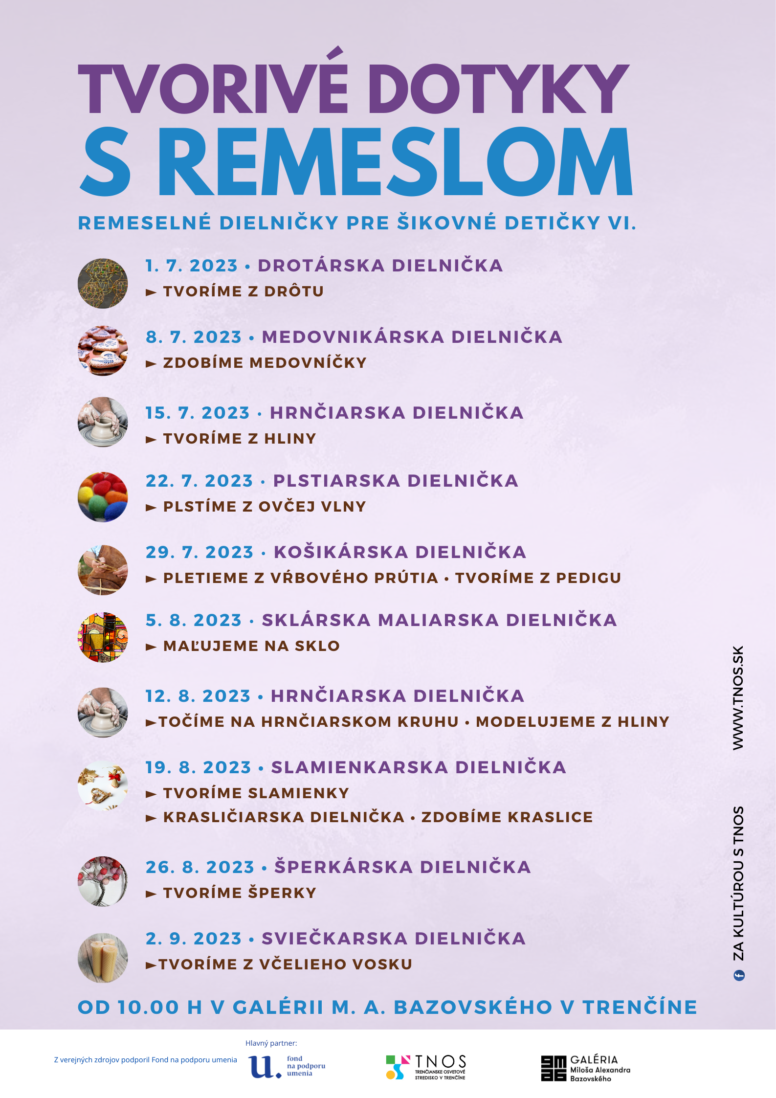 Trenčianske osvetové stredisko v Trenčíne realizuje už šiesty ročník cyklu remeselných tvorivých dielničiek s cieľom poskytnúť priestor na vzdelávanie v oblasti ľudového umenia. V čase letných prázdninových sobôt sa deti môžu tešiť na spoznávanie rôznych druhov remesiel pod vedením lektorov. Všetky vlastnoručne vyrobené dielka si odnesú domov.