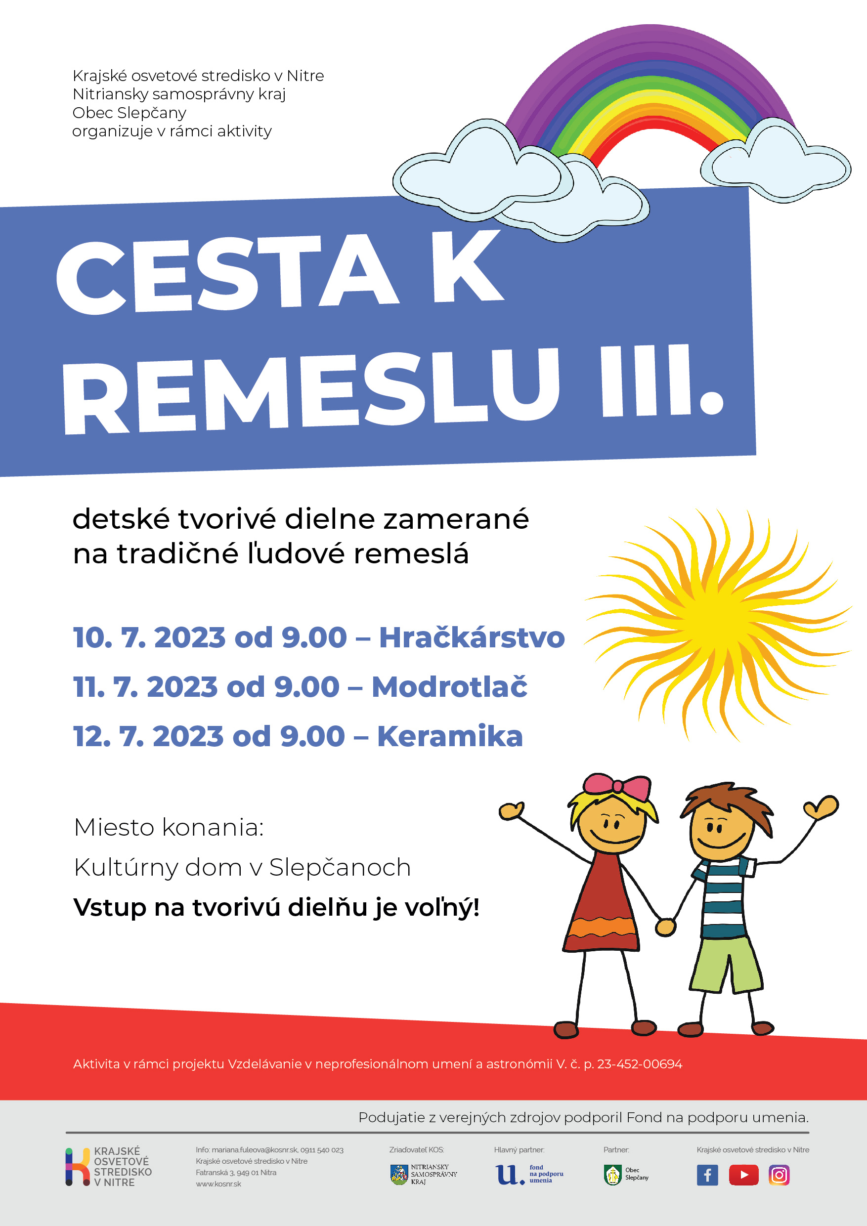 3. ročník remeselných tvorivých dielní pre deti a mládež obsahovo zamerané na ručne šitú hračku, modrotlač a keramiku. Kde: Kultúrny dom v Slepčanoch