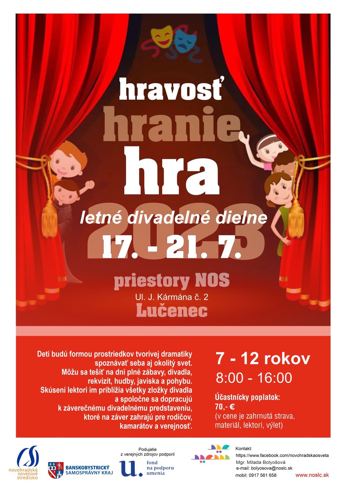 Zámerom projektu je poskytnúť rodičom školopovinných detí, aby v čase prázdnin mohli zabezpečiť pre svoje deti zmysluplné trávenie voľného času. Cieľom projektu je umožniť deťom formou prostriedkov tvorivej dramatiky spoznávať seba aj okolitý svet, rozvíjať potenciál dieťaťa formou hier, rozvíjať jeho zručnosti. Deti sa môžu tešiť na dni plné zábavy, divadla, rekvizít, hudby, javiska a pohybu. Skúsení lektori im priblížia všetky zložky divadla.