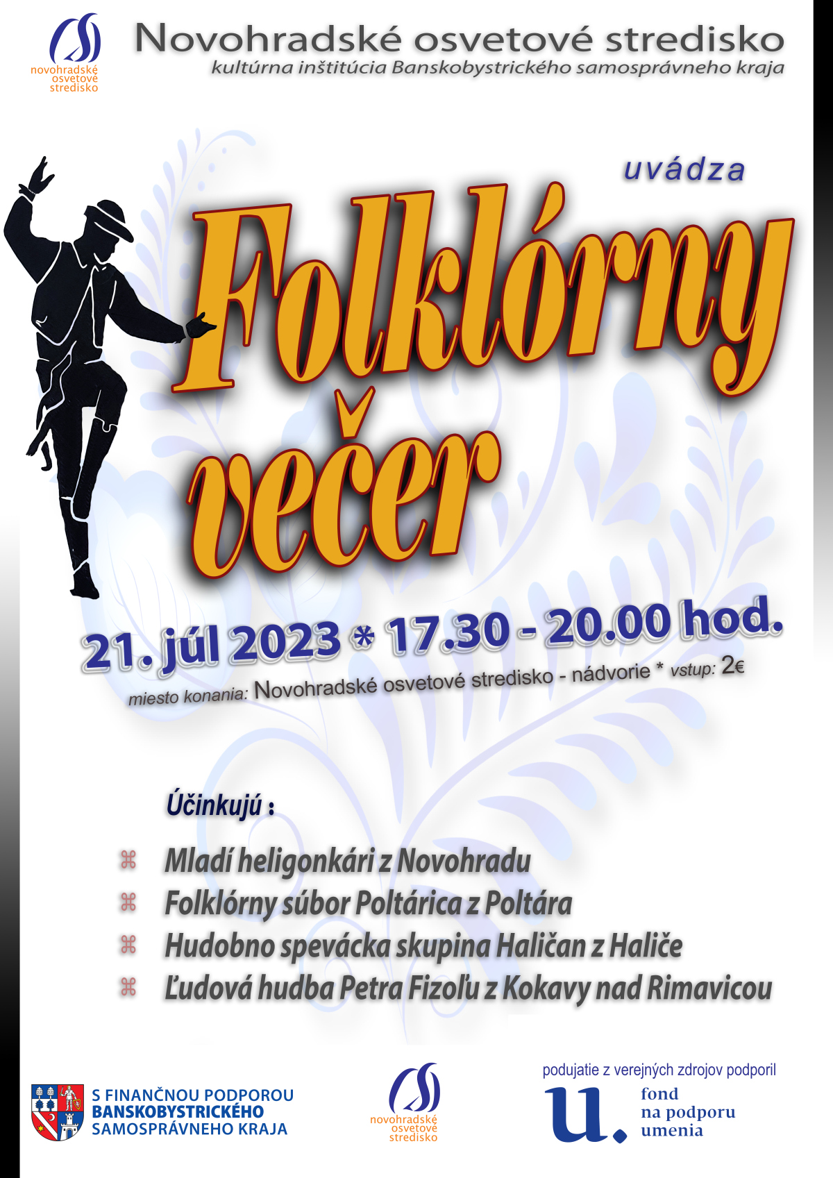 Večer venovaný folklóru - Priblížime návštevníkom históriu, súčasnú činnosť, či plány do budúcnosti folklórnych zoskupení v regióne Novohrad a Malohont. Podujatie je určené mládeži, dospelým a starším vekovým kategóriám.